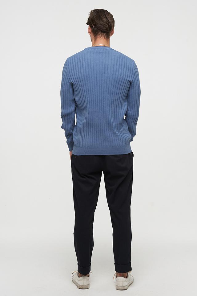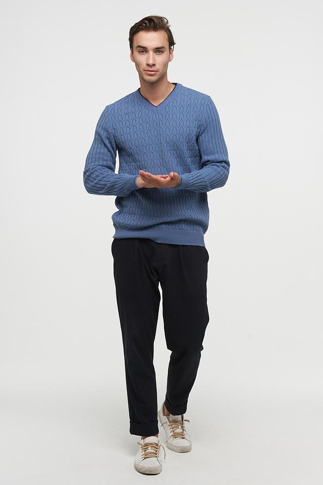 Мужской джемпер VAY голубого цвета с V-образным вырезом и текстурным узором в виде кос. Изготовлен из сочетания шерсти и хлопка, обеспечивая комфорт и тепло. Идеально подходит для создания стильного повседневного образа. Состав: пан 70%, шерсть 30%
