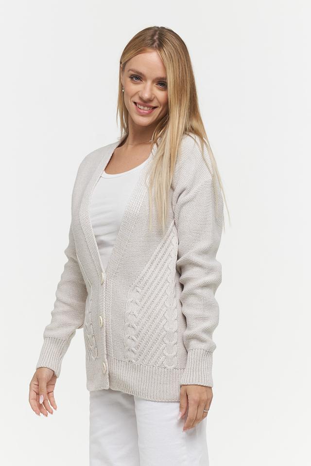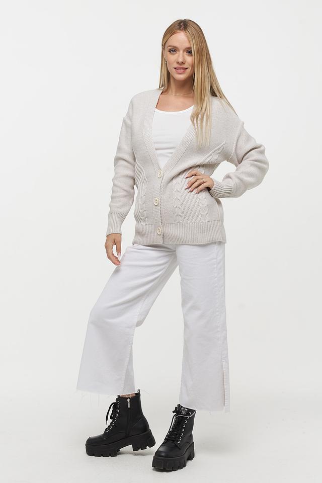 Дизайн кардигана дополнен красивым узором из кос, придающим ему особый шарм и элегантность. Модель имеет классический крой с V-образным вырезом и застежкой на пуговицы. Длинные рукава и свободный силуэт обеспечивают свободу движений.