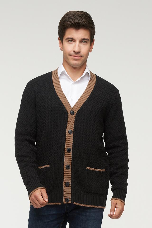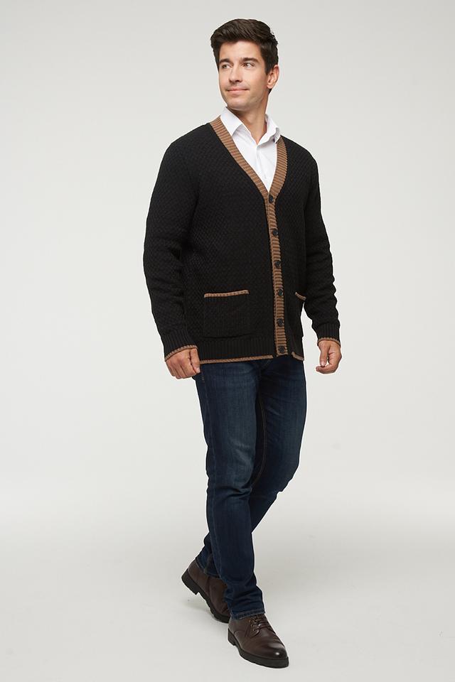 Мужской кардиган от VAY – это стильное и практичное решение для создания комфортного образа. Модель выполнена в классическом чёрном цвете с контрастной бежевой отделкой по краю V-образного выреза, планке и карманам.