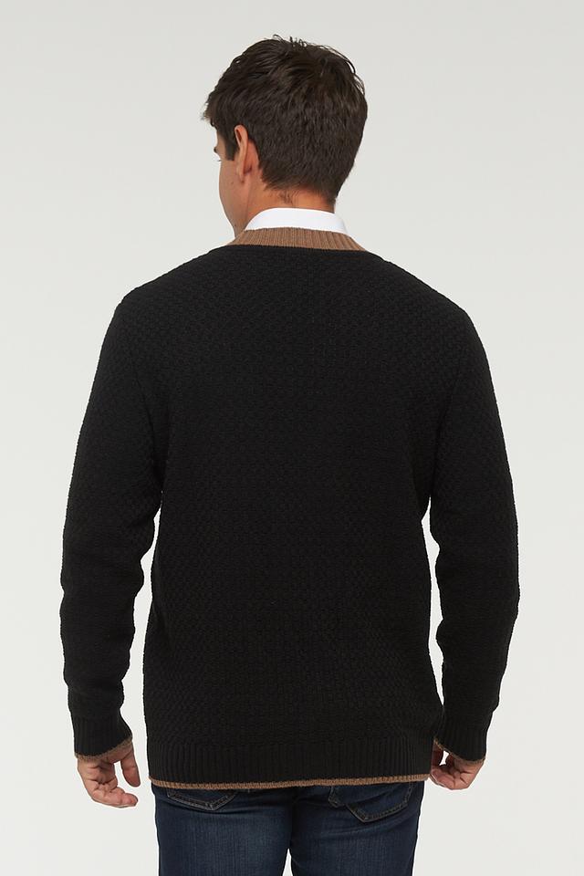 Мужской кардиган VAY чёрного цвета с V-образным вырезом и бежевой отделкой. Изготовлен из мягкой шерсти и пан, обеспечивающей комфорт и тепло. Классический дизайн, подходящий для повседневного ношения. Состав: шерсть 50%, пан 50%