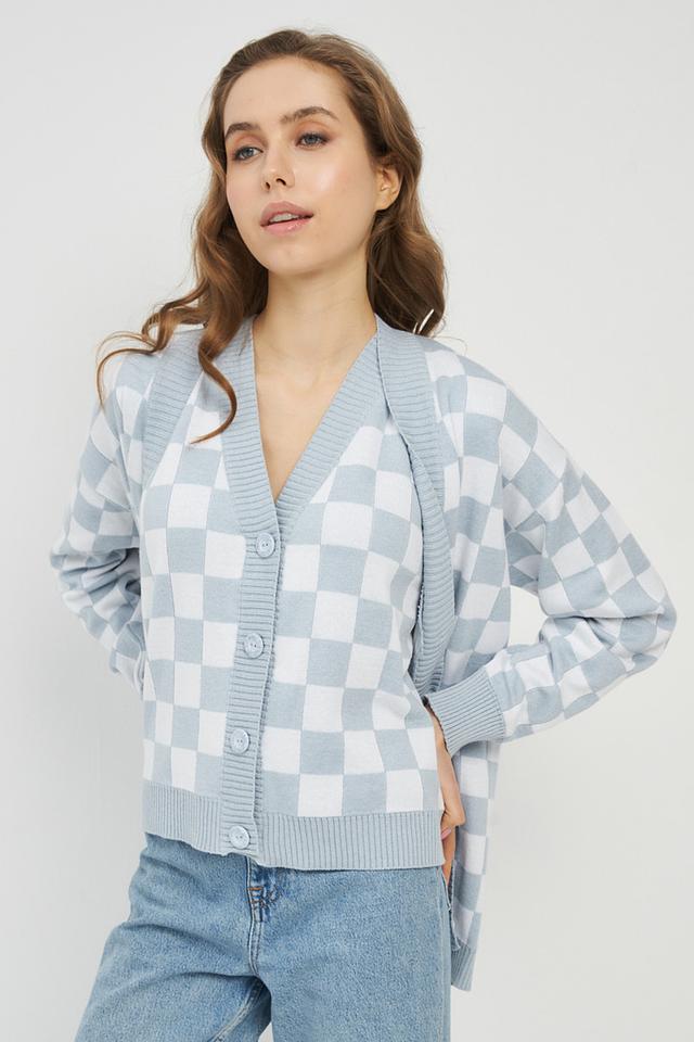 Женский жилет VAY голубого цвета выполнен в клетку и застегивается на пуговицы. Модель имеет V-образный вырез и прямой крой, идеально подходит для создания многослойных образов. Состав: хлопок 50%, пан 50%