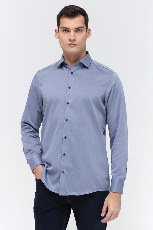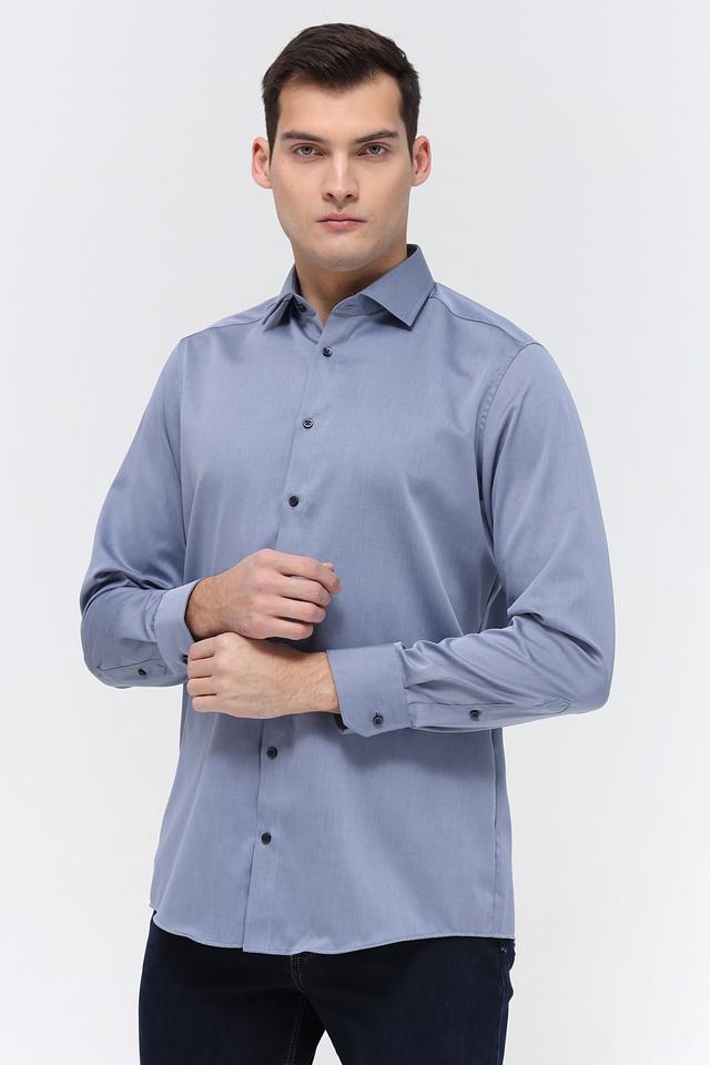 Рубашка имеет классический крой с длинными рукавами и приталенный силуэт, который подчеркивает фигуру. Застежка на пуговицах по всей длине обеспечивает удобство надевания и снятия. Воротник рубашки классической формы.