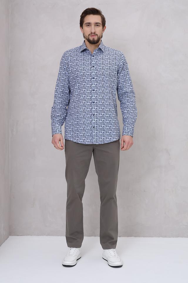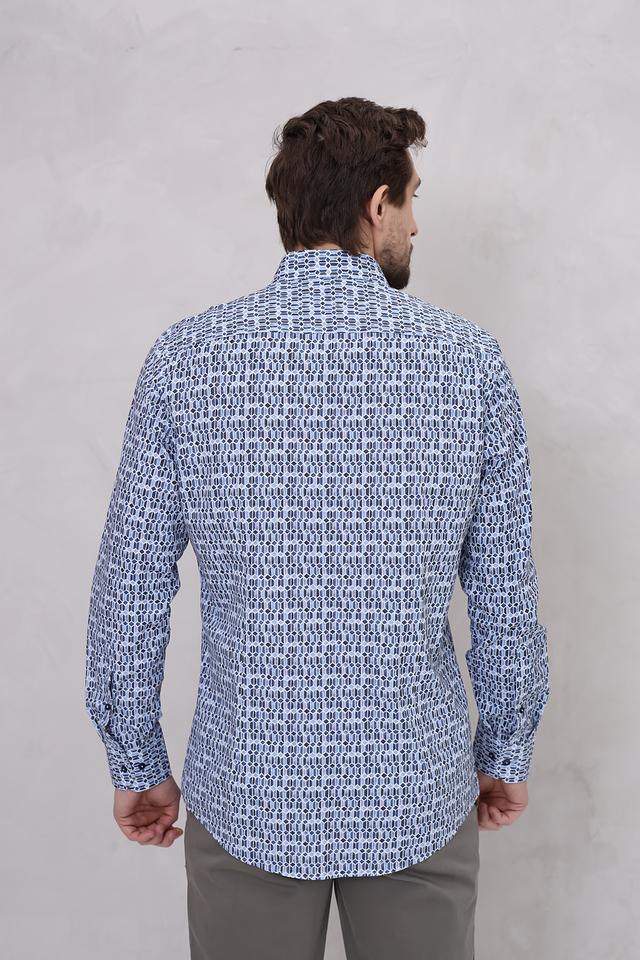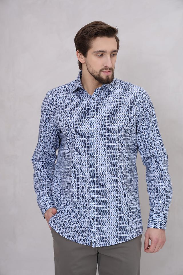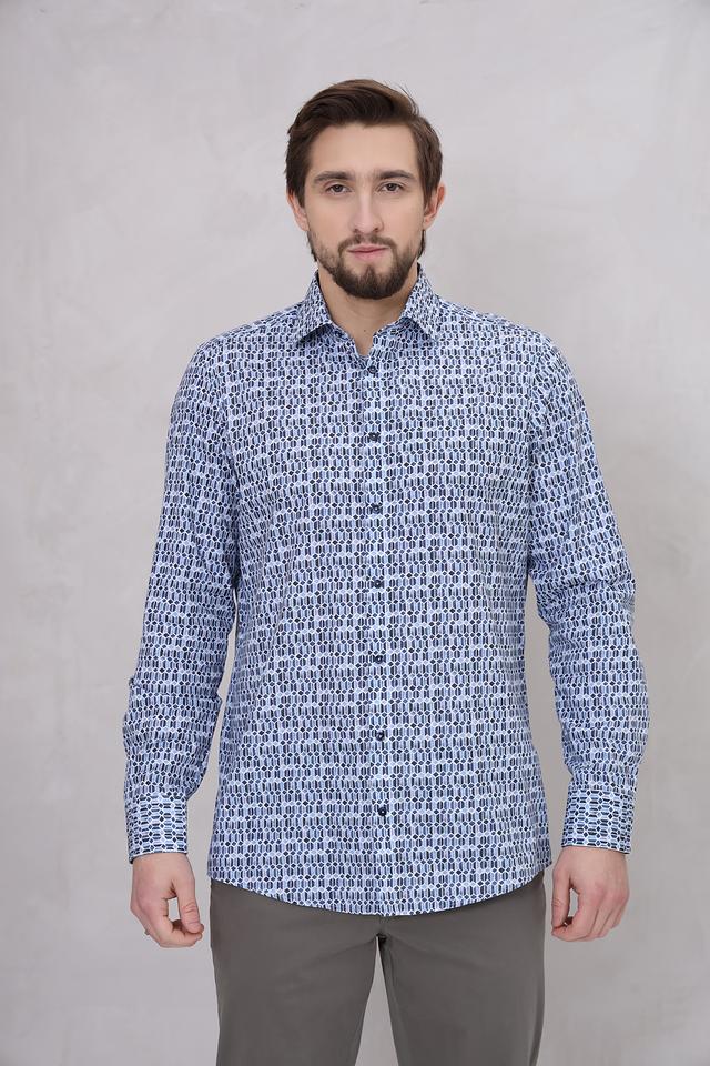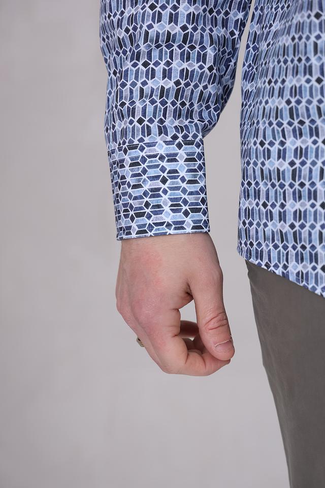 Особенностью данной модели является оригинальный геометрический принт, выполненный в сочетании голубых и тёмно-синих оттенков. Этот принт добавляет рубашке современный и стильный вид, делая ее подходящей как для повседневной носки, так и для более формальных мероприятий.