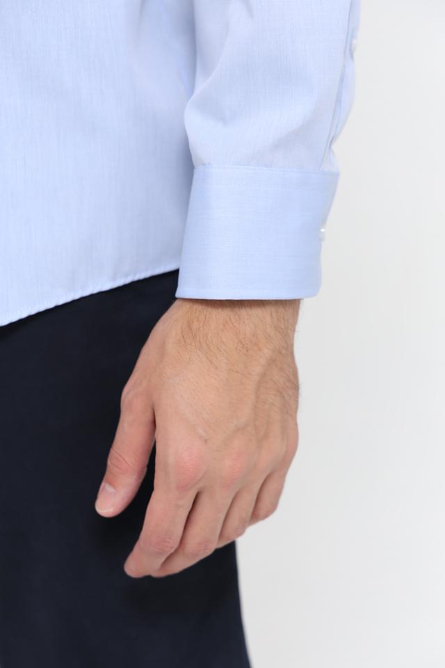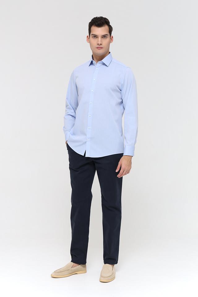 Рубашка имеет классический крой, длинные рукава и стандартную воротничковую стойку. Изготовлена из 100% хлопка, что обеспечивает комфорт при носке и позволяет коже дышать. Ткань приятна на ощупь и проста в уходе.