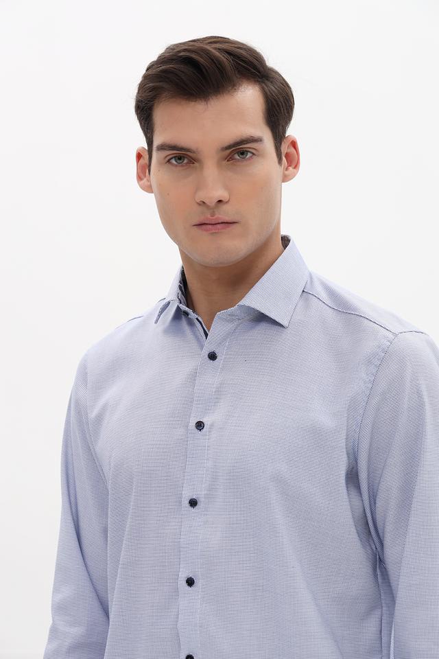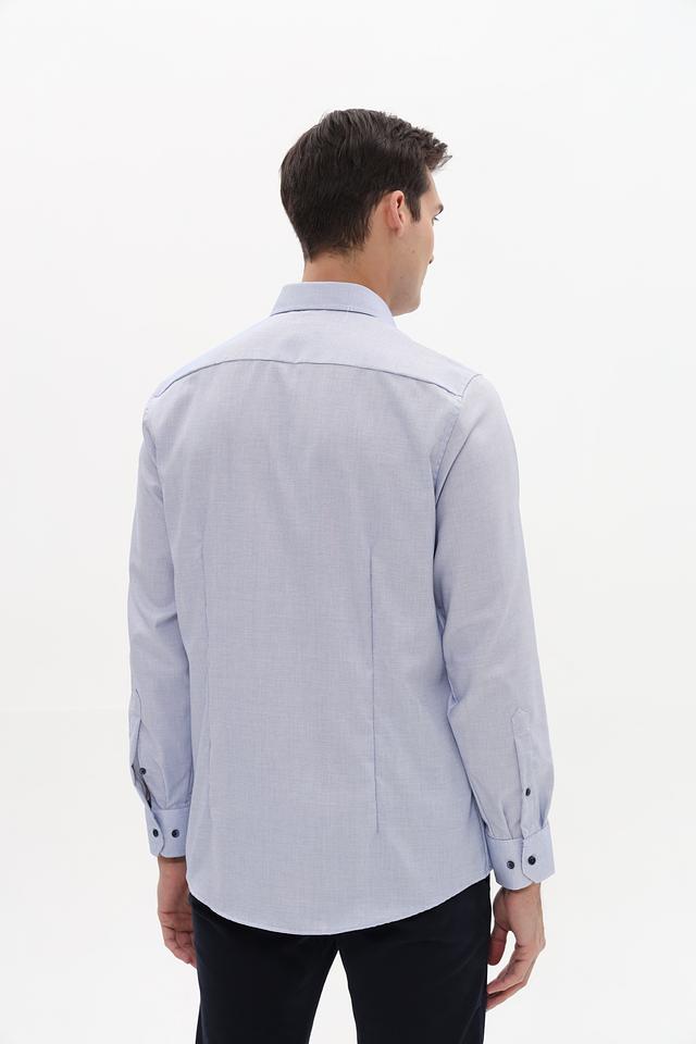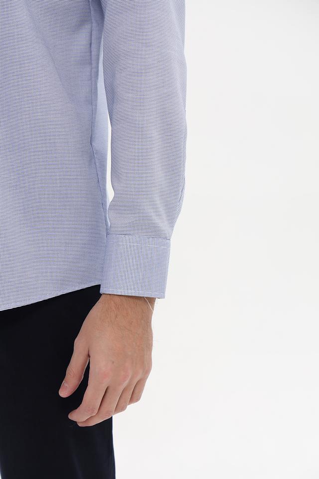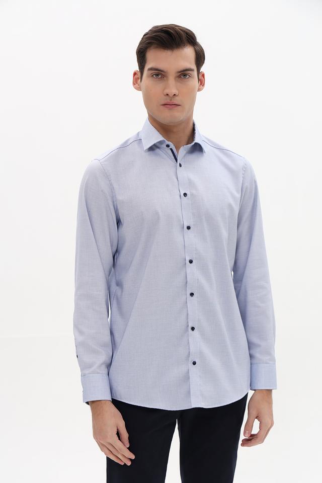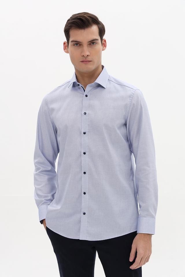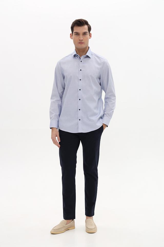 Рубашка имеет классический крой, длинные рукава и воротник с небольшим разворотом. Застежка на пуговицы, манжеты на пуговицах. Изготовлена из 100% хлопка, что обеспечивает комфорт и воздухопроницаемость.