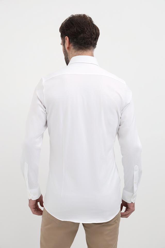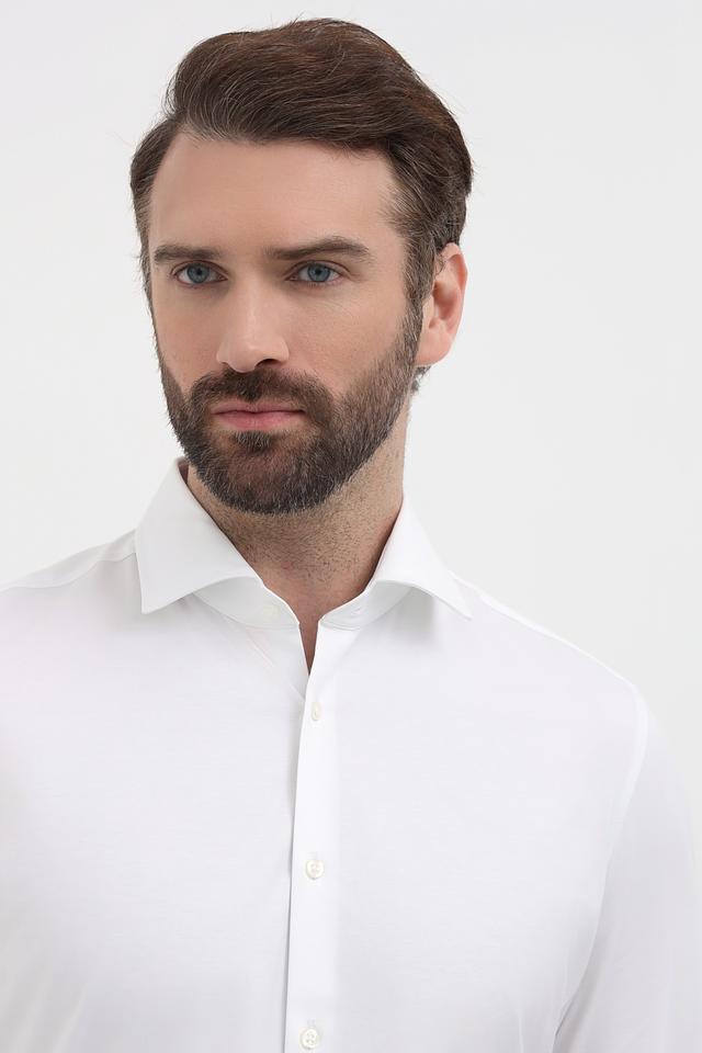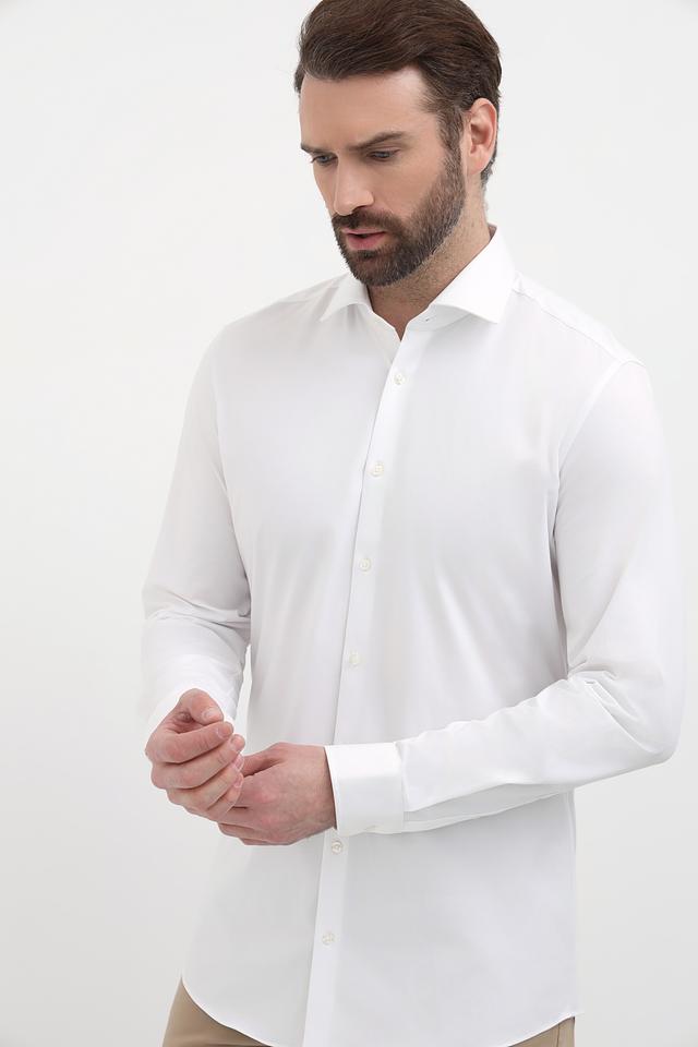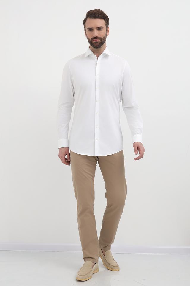 Детали, такие как аккуратный воротник, планка с пуговицами и манжеты, подчеркивают внимание к деталям. Рубашка имеет длинные рукава, которые можно закатать для создания более расслабленного образа. Преобладающий цвет – белый, что позволяет легко сочетать ее с различными брюками и аксессуарами.