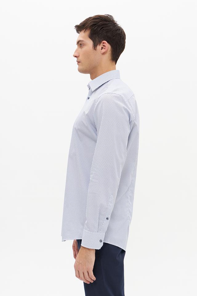 Особенностью данной модели является мелкий геометрический принт, который добавляет рубашке оригинальности и индивидуальности. Рубашка идеально сочетается с брюками чинос, джинсами или классическими брюками, а также с пиджаком или кардиганом. Прекрасный выбор для создания элегантного и современного образа.