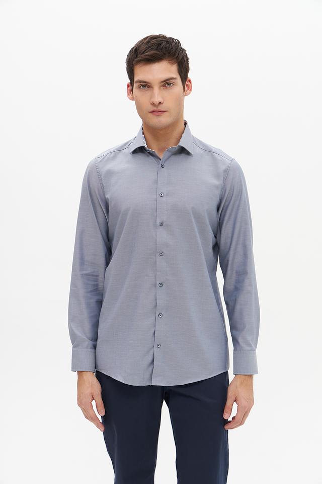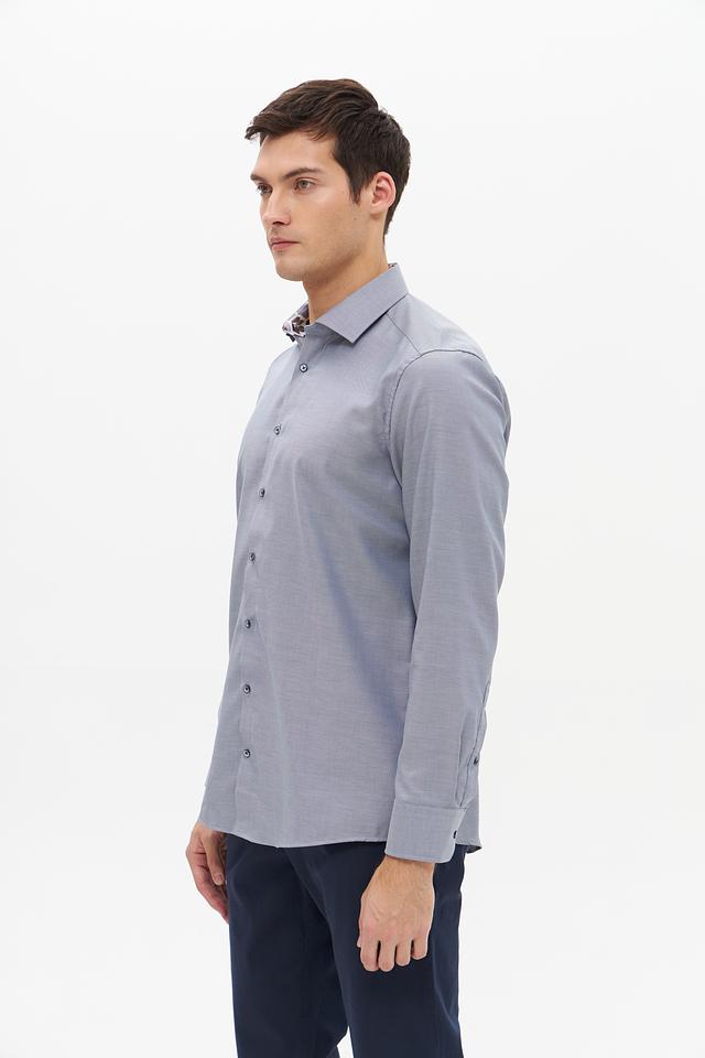 Цвет рубашки – серый, спокойный и универсальный, легко сочетается с другими элементами гардероба. Рубашка имеет длинные рукава и стандартный воротник. Застежка на пуговицах по всей длине переда.