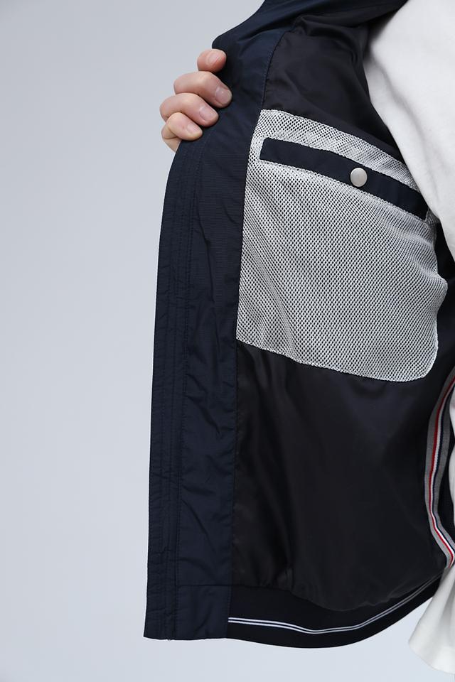 Куртка имеет классический крой, воротник-стойку и застёжку-молнию. На рукавах и по низу куртки – эластичная белая полоса, добавляющая динамики образу. Два боковых кармана на молнии обеспечивают удобное хранение необходимых мелочей.