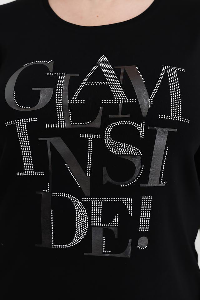 Основным акцентом футболки является яркий принт "GLAM INSIDE!", выполненный с использованием декоративных элементов, имитирующих стразы. Это придает изделию особую изысканность и привлекательность.