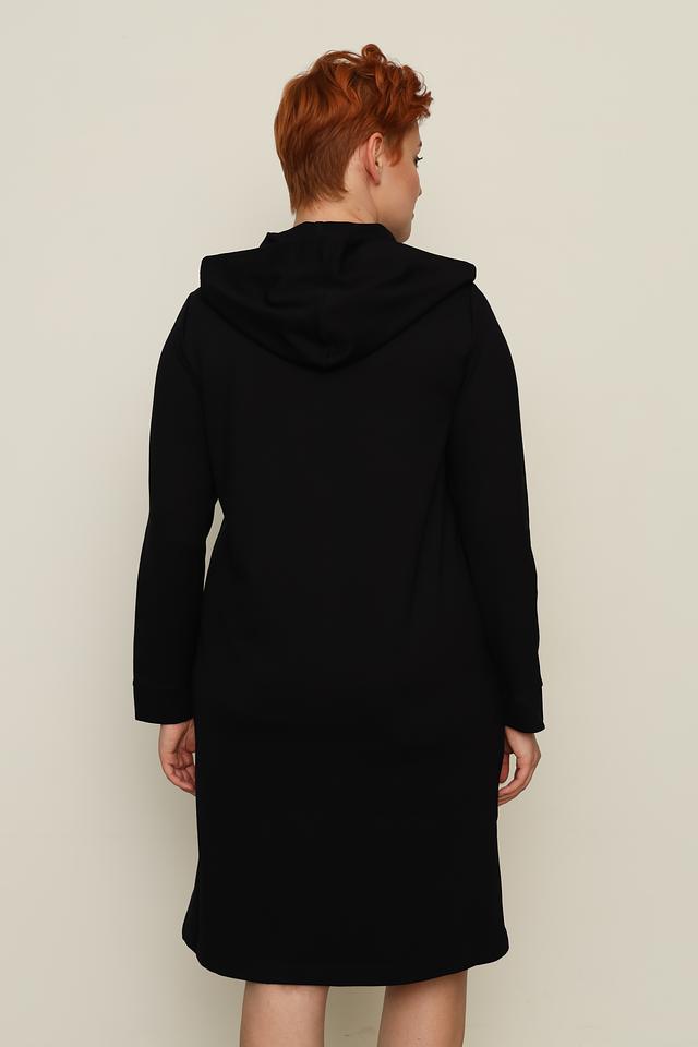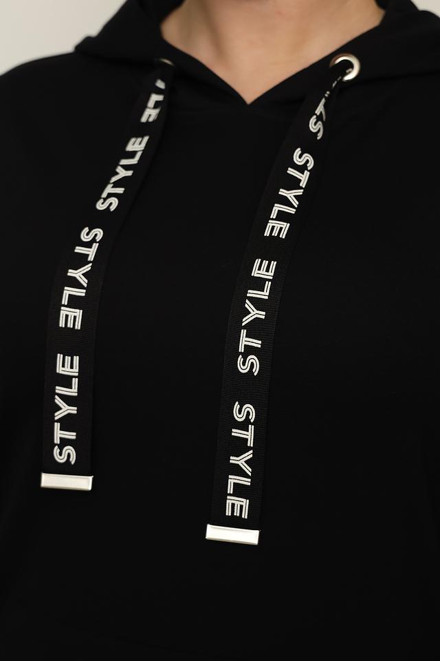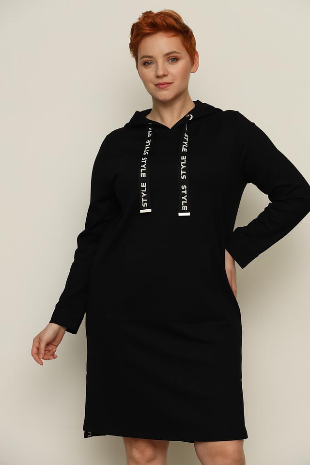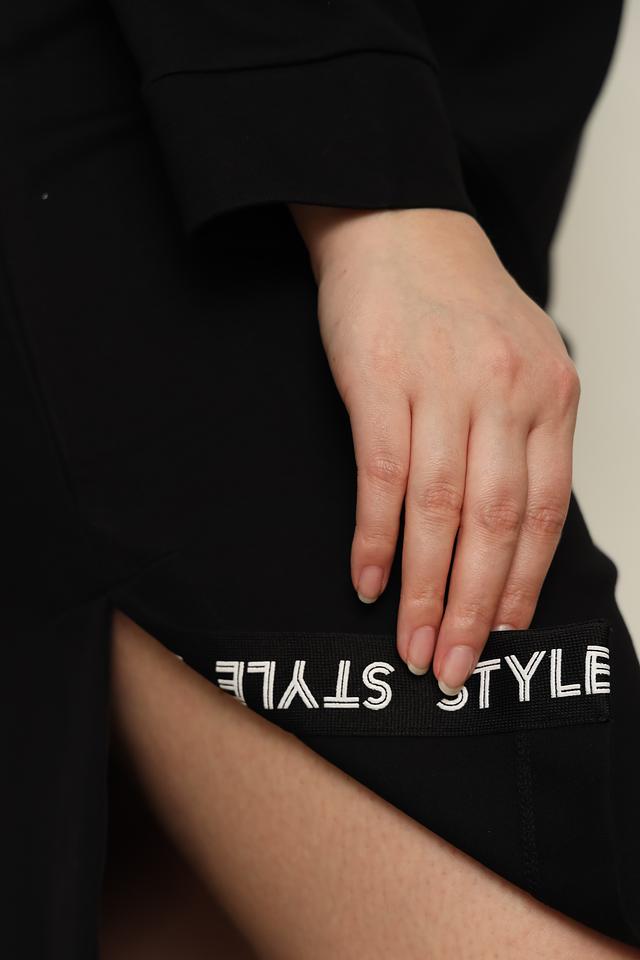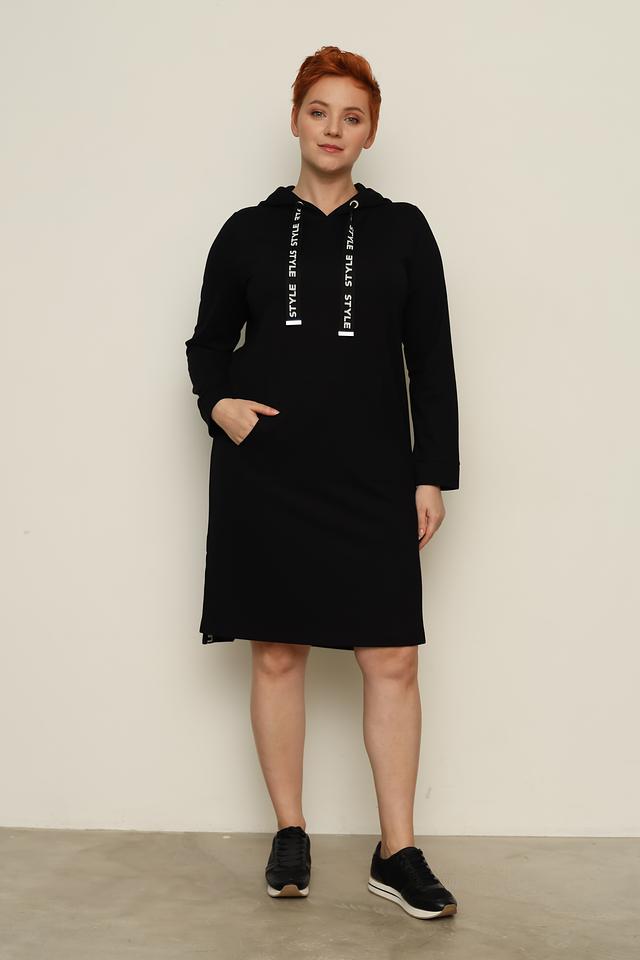 Платье имеет прямой крой, капюшон и длинные рукава. На груди и капюшоне расположена надпись "STYLE STYLE STYLE", выполненная белым цветом, что добавляет образу динамичности и современности. Модель дополнена карманами.
