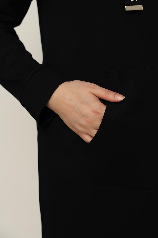 Черное платье от Via Appia – это удобная и стильная модель с капюшоном и надписью. Платье выполнено из мягкой вискозы с добавлением полиэстера и эластана, обеспечивающих комфорт и хорошую посадку. Состав: вискоза 70%, полиэстер 25%, эластан 5%