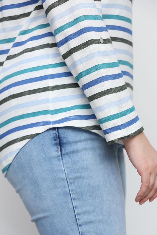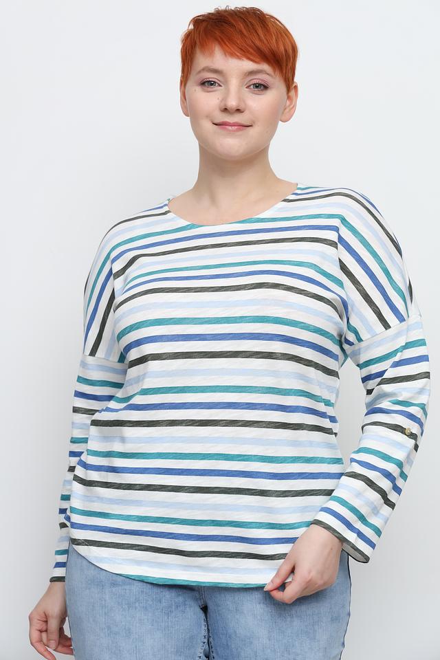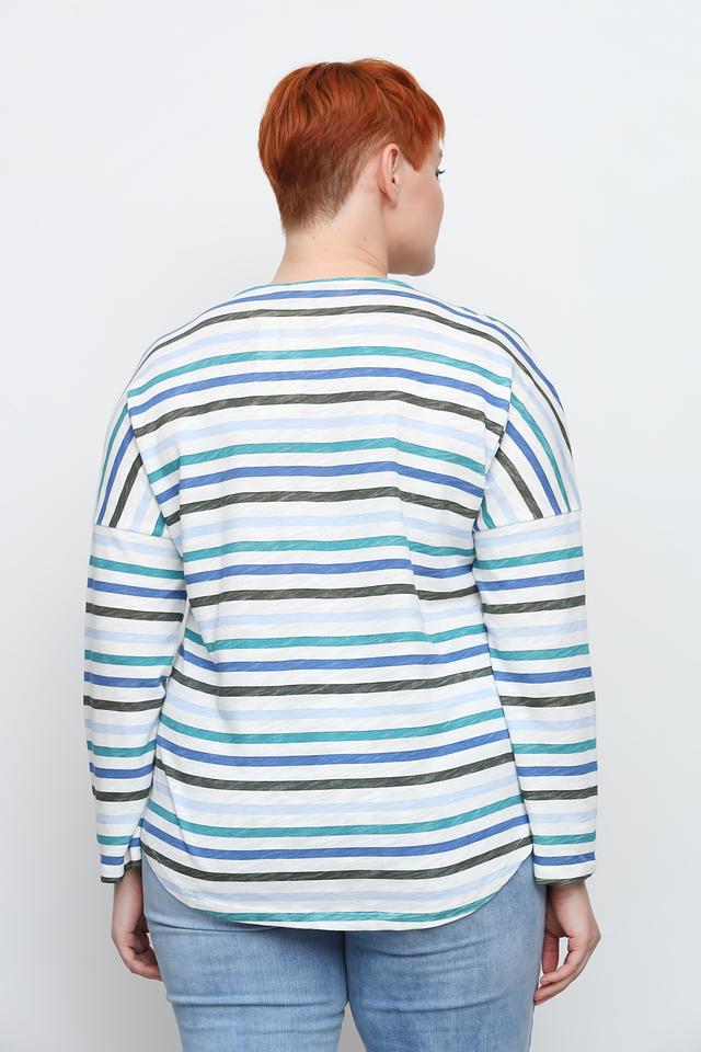 Лонгслив имеет свободный крой, который не сковывает движения и позволяет создать расслабленный образ. Горизонтальная полоска в сине-зелёной гамме придает изделию свежий и современный вид.