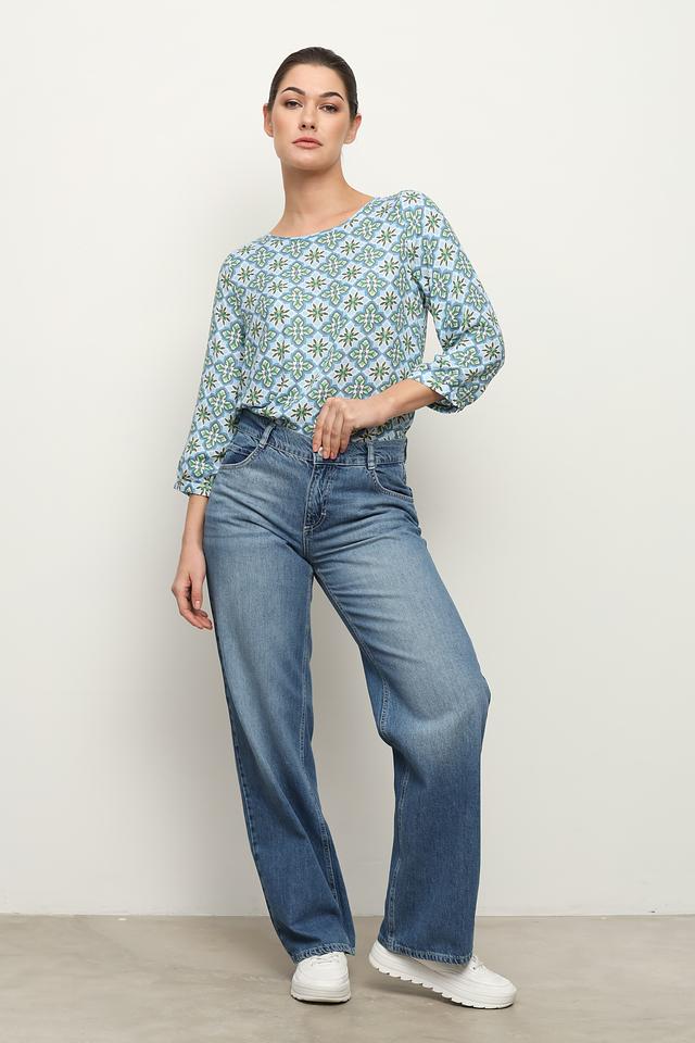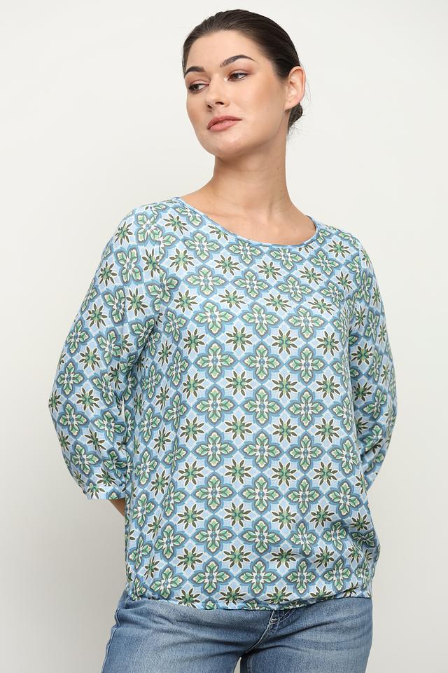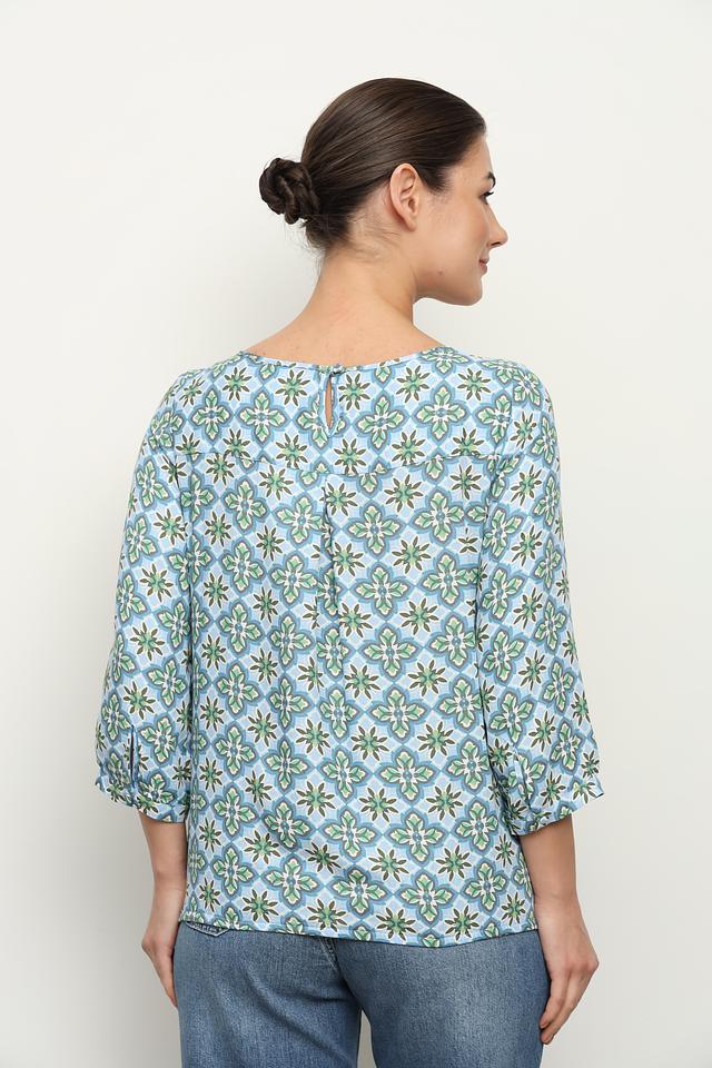 Особенностью данной модели является яркий и запоминающийся принт в голубых и зеленых тонах, который добавит вашему образу индивидуальности. Блуза идеально сочетается с джинсами, брюками или юбками, создавая стильный и непринужденный образ.