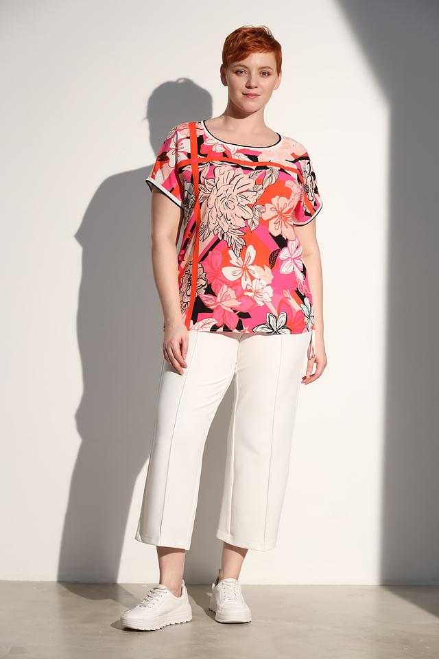 Основной цвет блузы – розовый, но она украшена крупным, детализированным цветочным принтом, включающим в себя оттенки розового, оранжевого, белого и черного. Принт создает эффектный и запоминающийся образ.