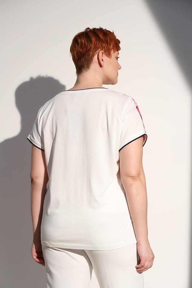 Блуза имеет круглый вырез горловины и короткие рукава. Отделка горловины и рукавов выполнена черной тесьмой, что добавляет контрастности и завершенности дизайну. Свободный крой обеспечивает удобство и позволяет легко сочетать блузу с различными предметами гардероба.