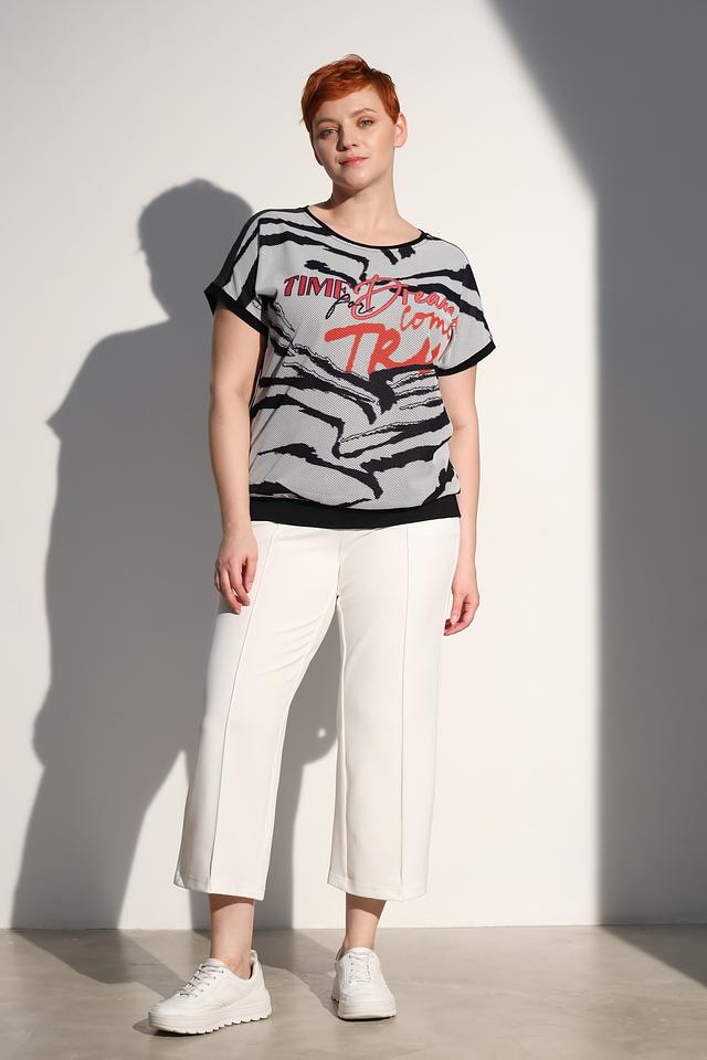 Женская футболка Via Appia DUE серого цвета с оригинальным принтом в виде абстрактных полос и надписей. Модель выполнена из мягкой вискозы с добавлением эластана для комфортной посадки и свободы движений. Состав: вискоза 90%, эластан 10%