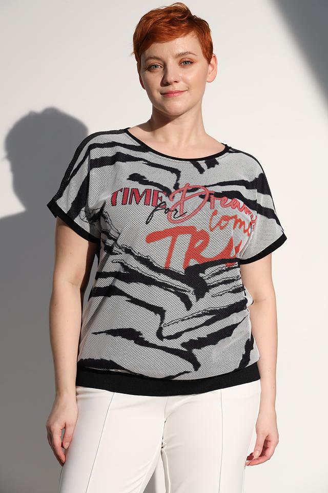 Основной цвет футболки – серый, но благодаря оригинальному принту она выглядит очень эффектно и современно. Принт выполнен в виде абстрактных черных полос и красных надписей, что придает ей индивидуальность.
