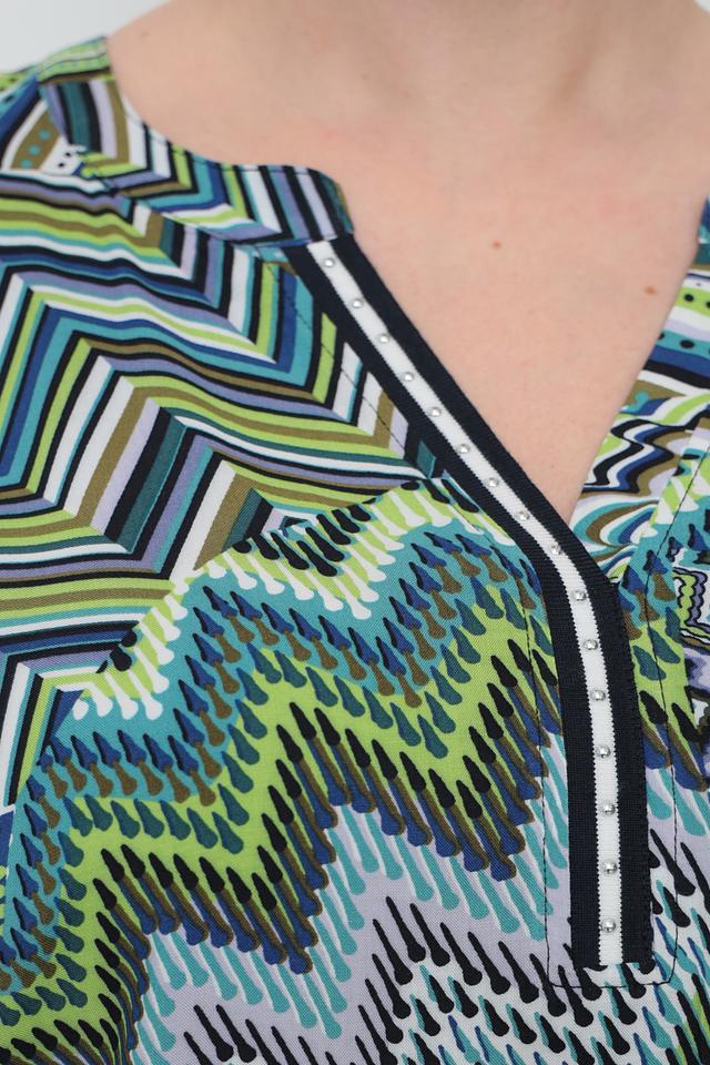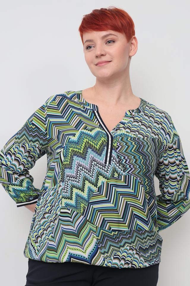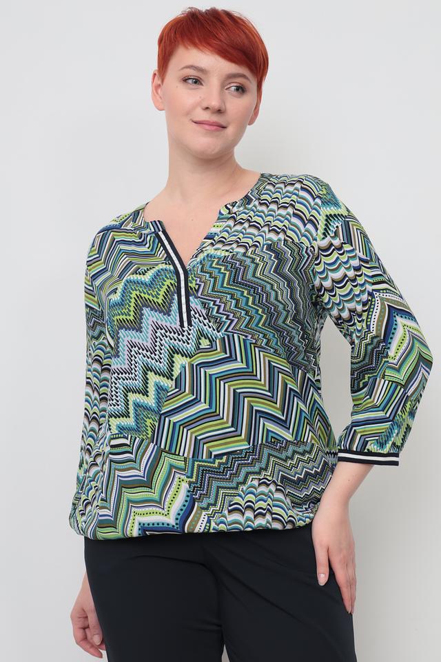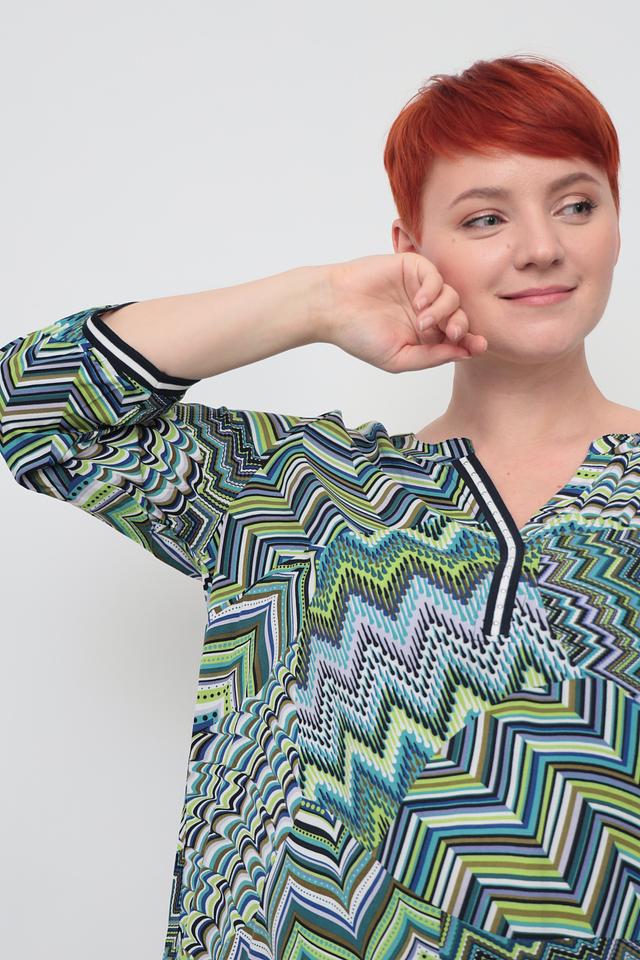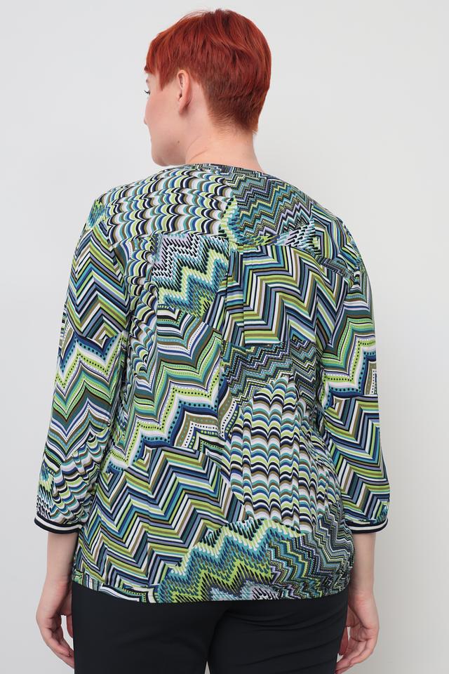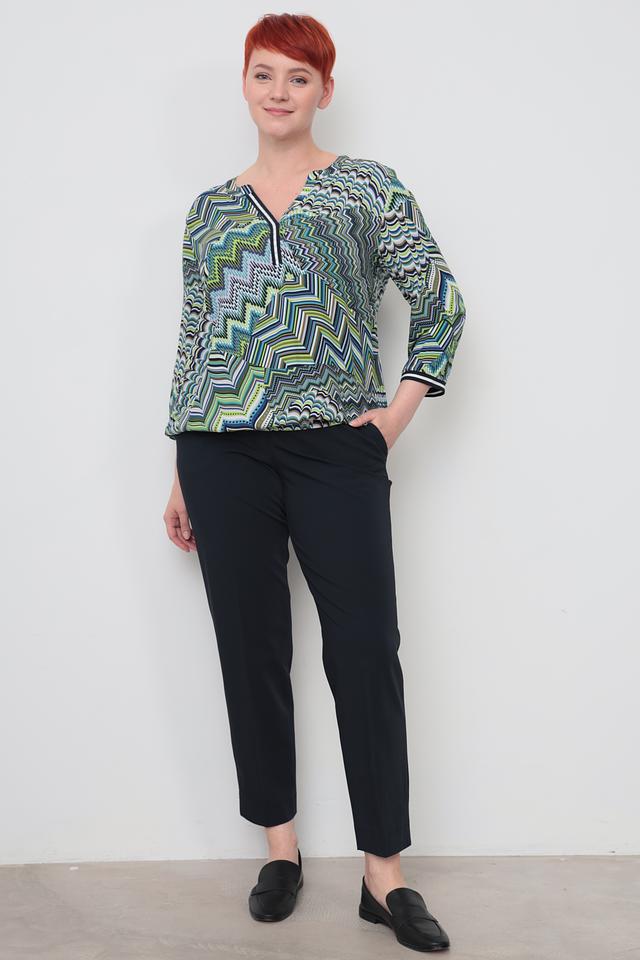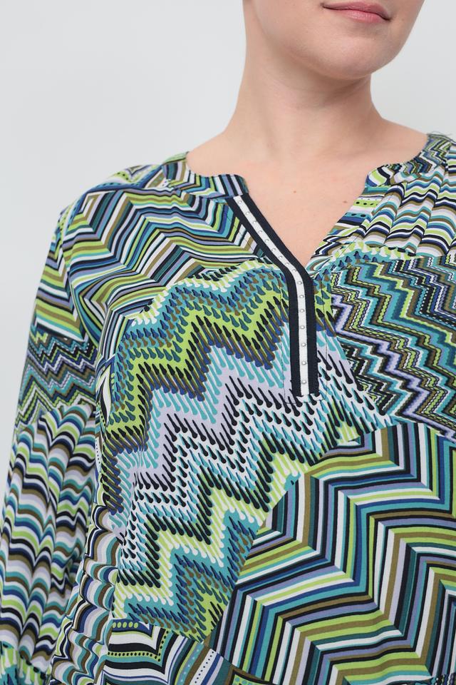 Блуза имеет V-образный вырез горловины с небольшим декоративным шнурком. Рукава длиной три четверти. Приталенный силуэт подчеркивает фигуру, а оригинальный геометрический принт добавляет образу динамичности.