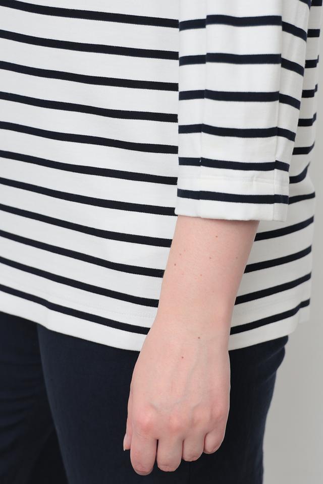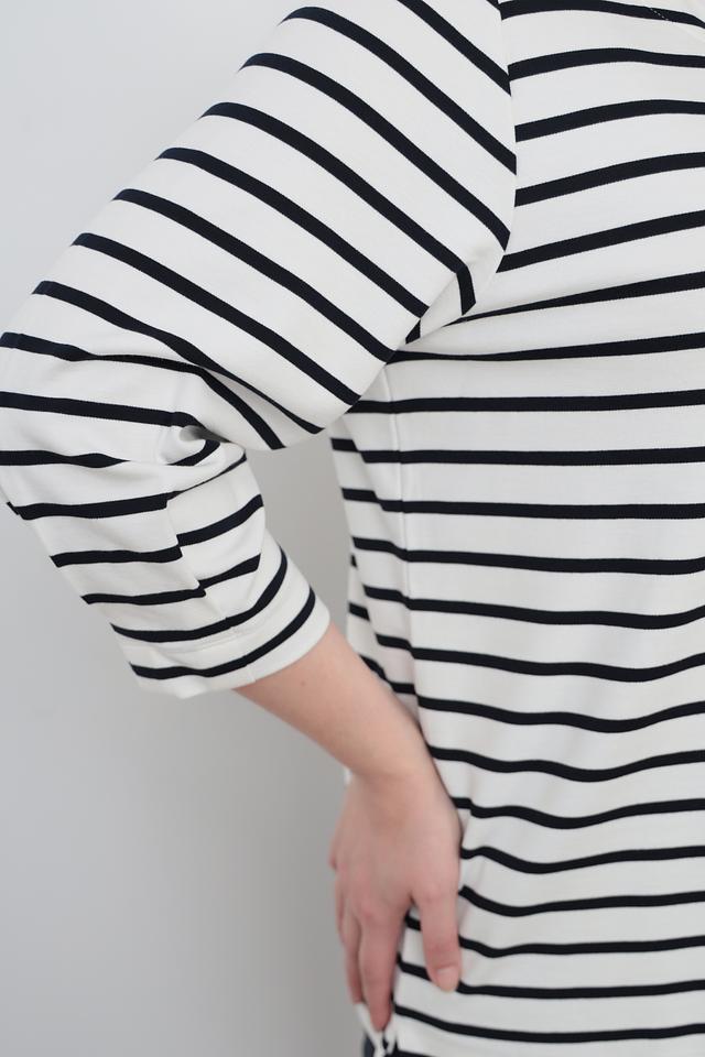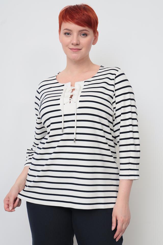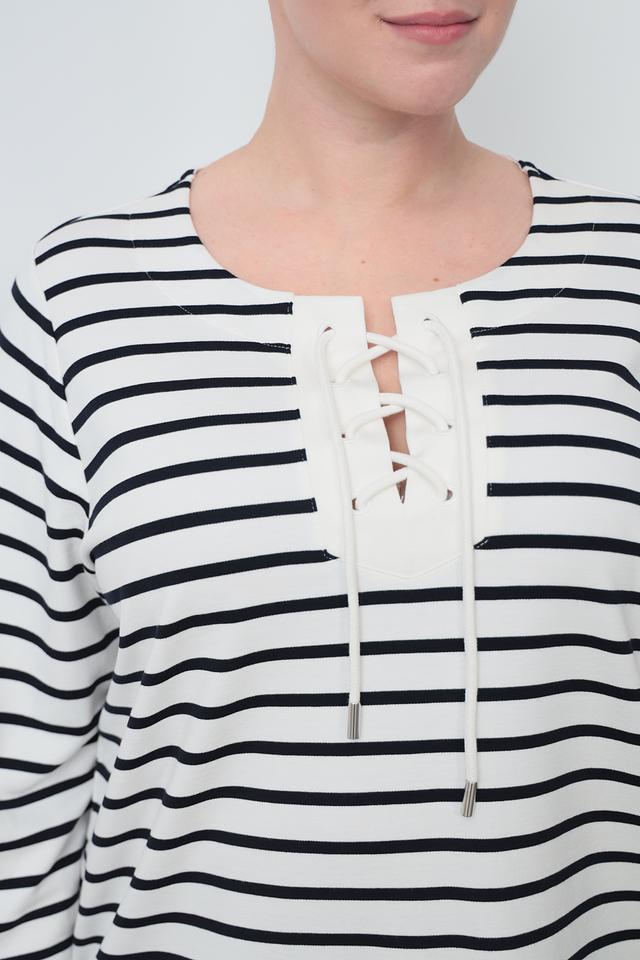Лонгслив Via Appia в бело-синюю полоску – стильная и комфортная модель с рукавом 3/4 и оригинальным вырезом с завязками. Изготовлен из мягкой вискозы с добавлением полиэстера и эластана, обеспечивающих приятные тактильные ощущения и хорошую посадку. Состав: вискоза 84%, полиэстер 14%, эластан 2%