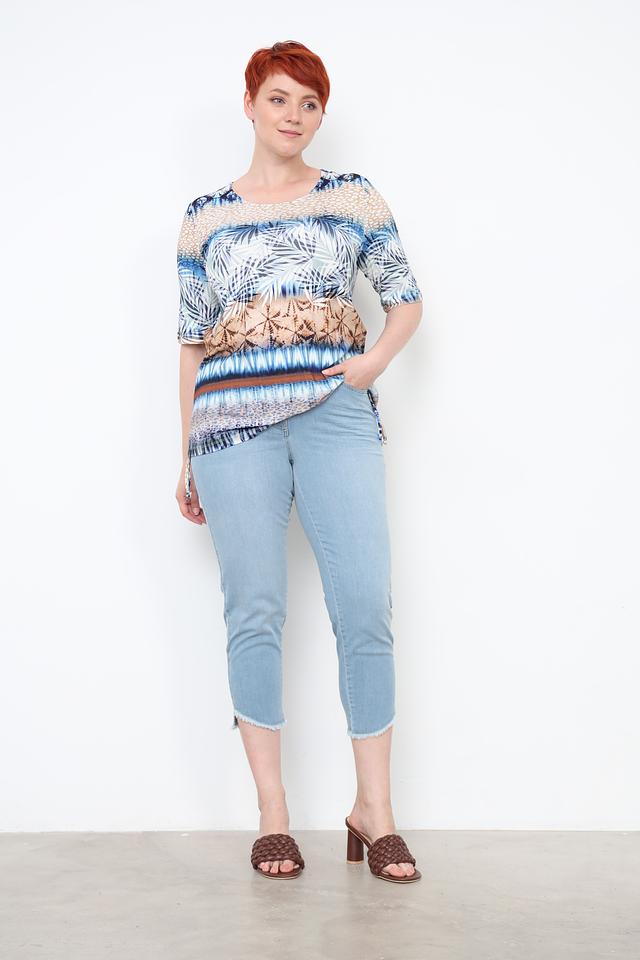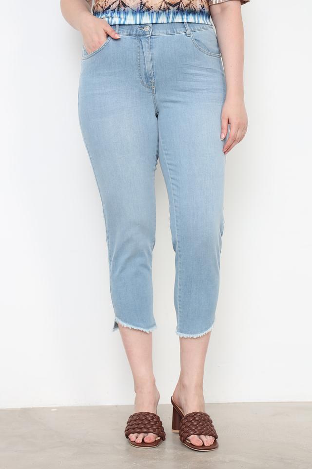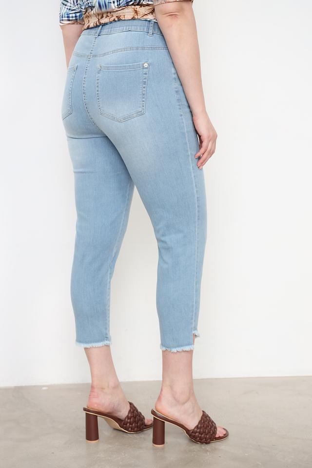 Джинсы имеют укороченный крой, который идеально подходит для создания модных образов в тёплое время года. Эластичный пояс обеспечивает комфортную посадку по фигуре, не стесняя движений. Классическая застёжка на пуговицу и молнию дополняет функциональность модели.