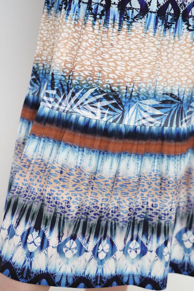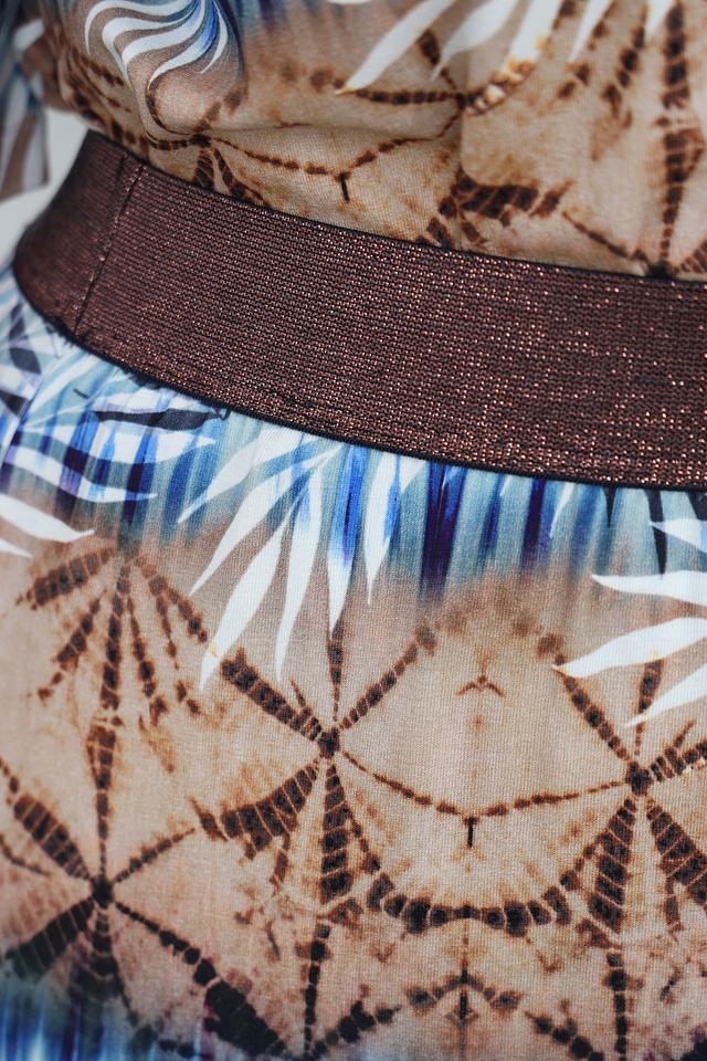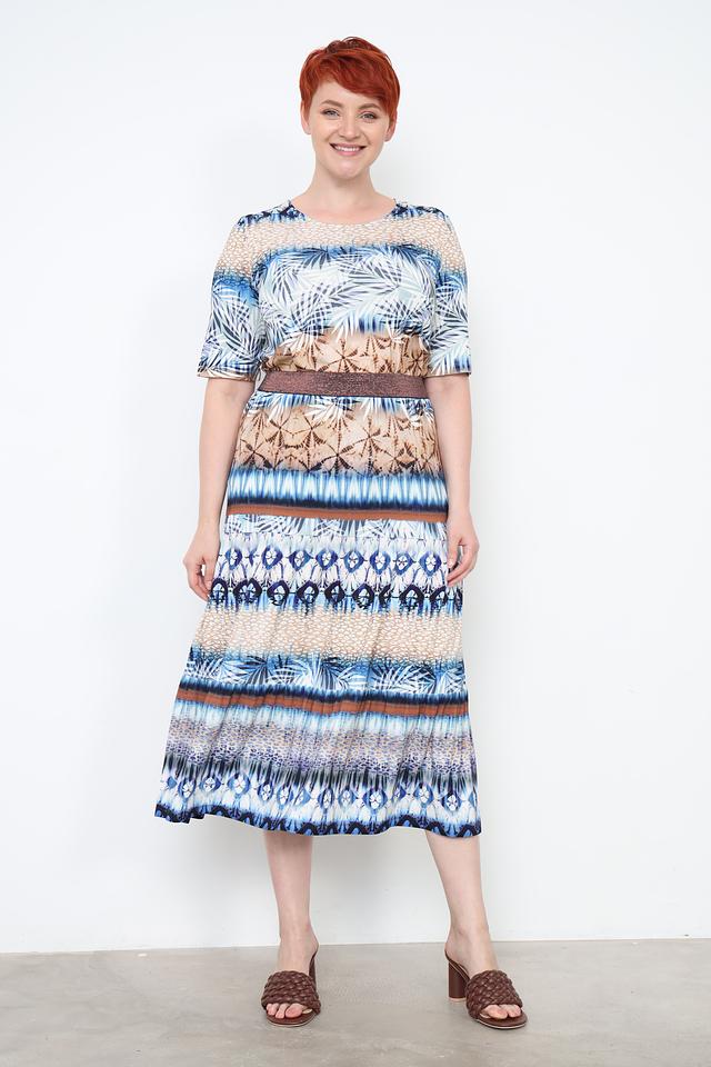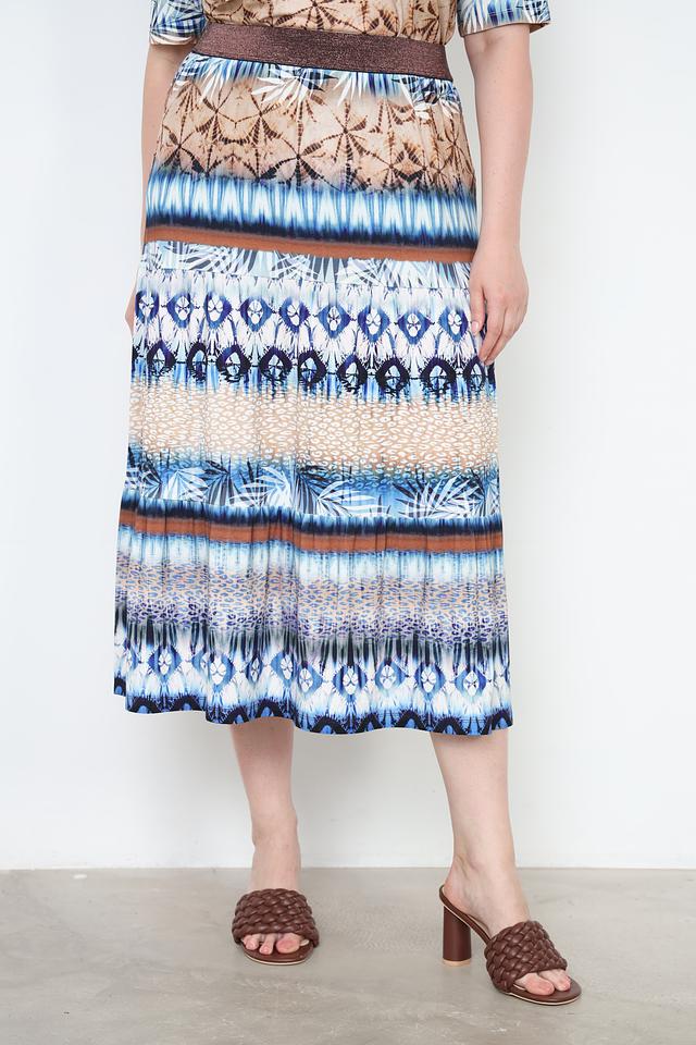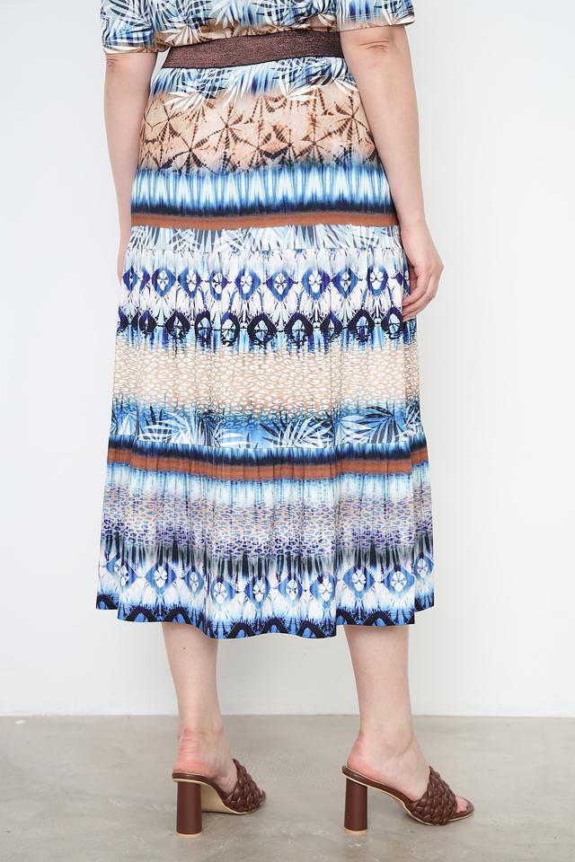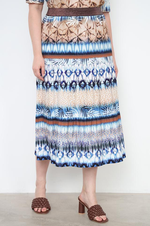 Юбка имеет длину миди и оформлена эффектным принтом, сочетающим в себе различные оттенки синего, коричневого и бежевого цветов. Принт выполнен в виде абстрактных узоров, напоминающих элементы природы.