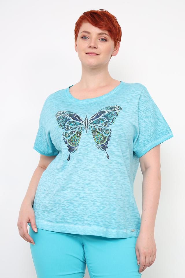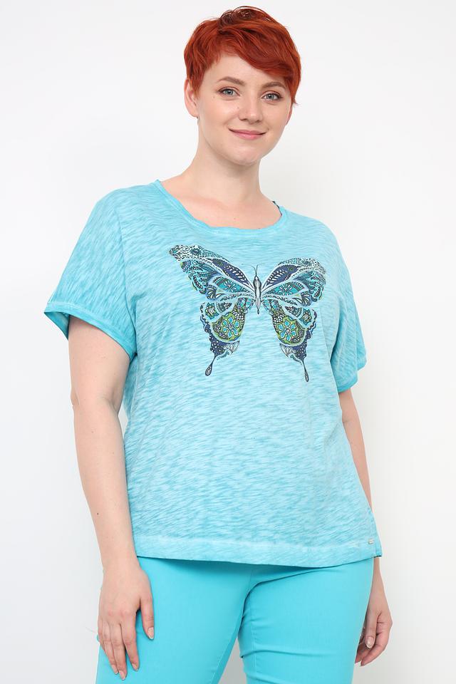 Женская футболка Via Appia бирюзового цвета украшена ярким принтом в виде бабочки. Модель свободного кроя с короткими рукавами выполнена из мягкого и приятного к телу сочетания хлопка и вискозы. Состав: хлопок 52%, вискоза 48%