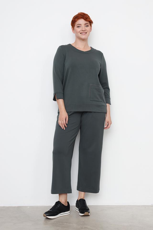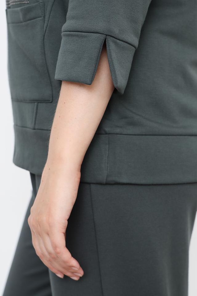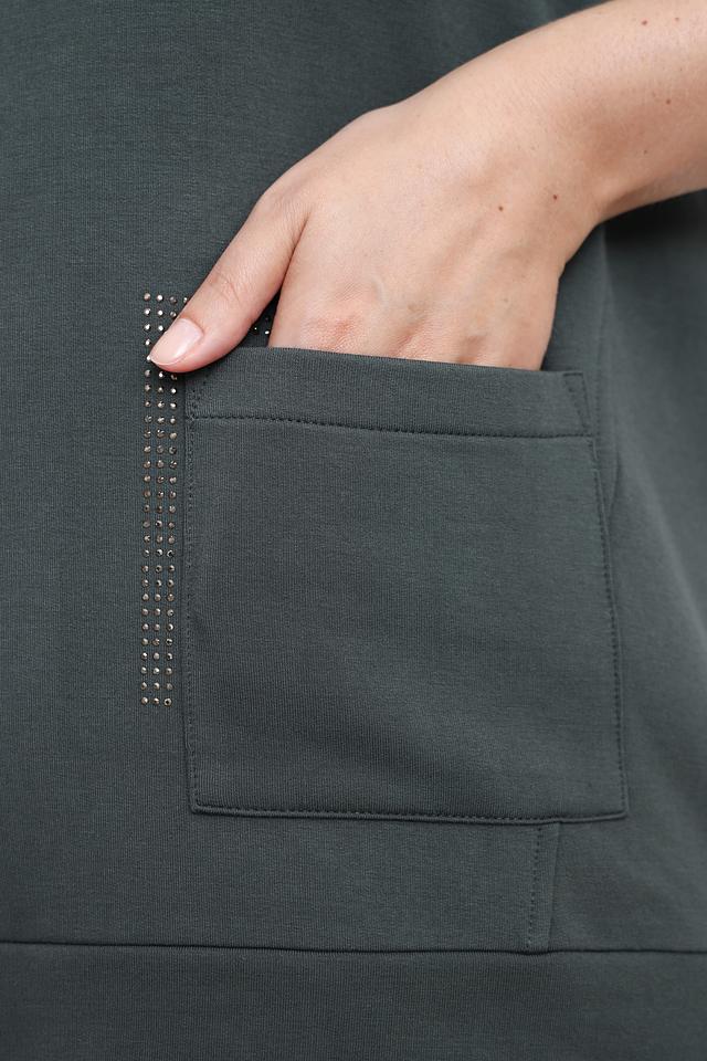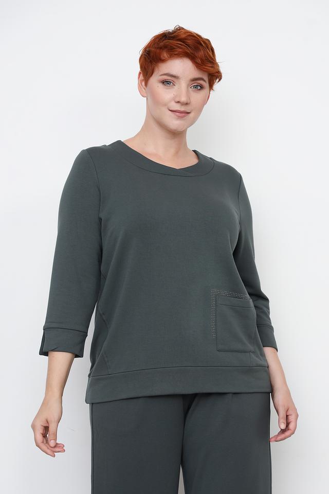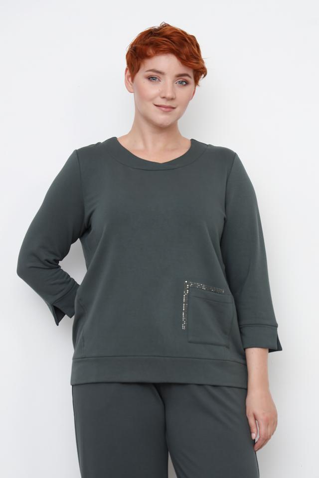 Пуловер имеет прямой крой, округлый вырез горловины и рукава три четверти. На левой стороне изделия расположен накладной карман, декорированный рядом из страз, что придает модели изысканность.
