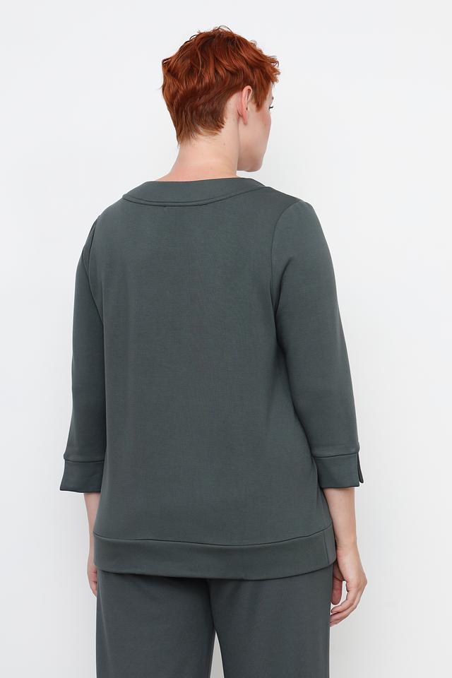 Зелёный пуловер Via Appia DUE из мягкой вискозы с добавлением полиэстера и эластана. Модель имеет удобный крой с рукавами 3/4 и округлым вырезом горловины, украшенным декоративной отделкой из страз. Состав: вискоза 69%, полиэстер 25%, эластан 6%