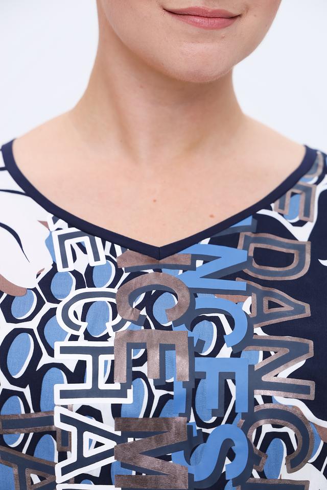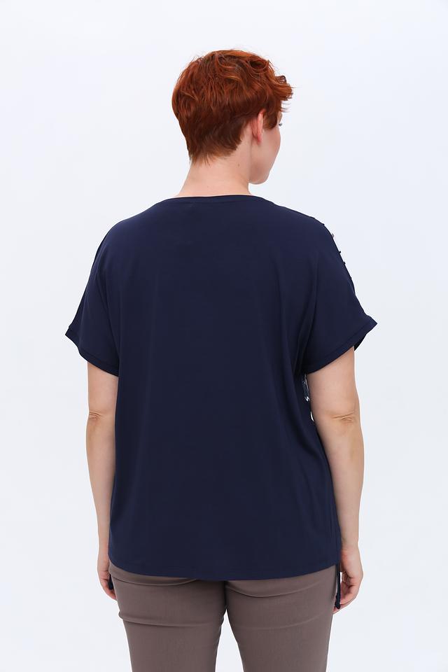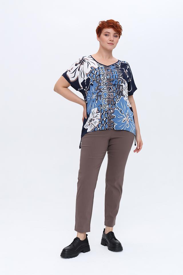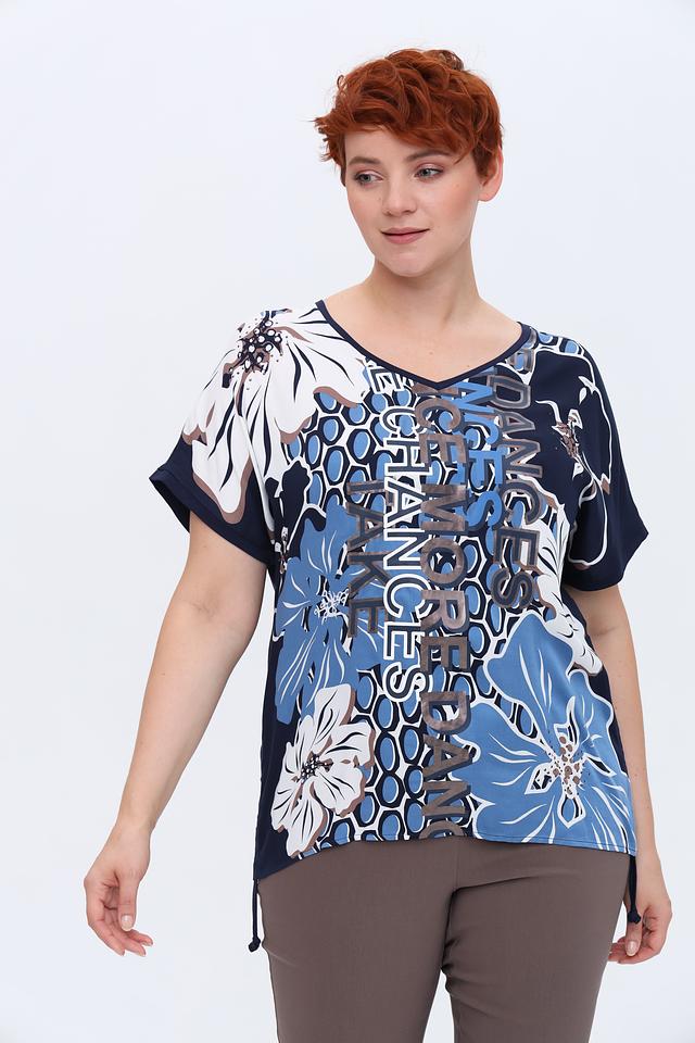 Женская футболка Via Appia синего цвета с ярким цветочным принтом и надписями. Модель свободного кроя с короткими рукавами выполнена из мягкой вискозы с добавлением эластана для комфорта. Состав: вискоза 94%, эластан 6%