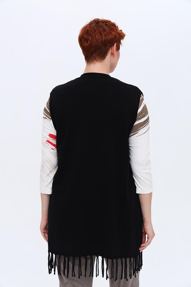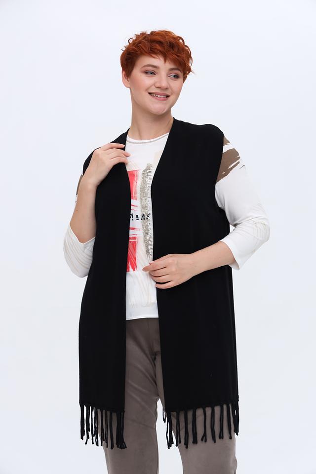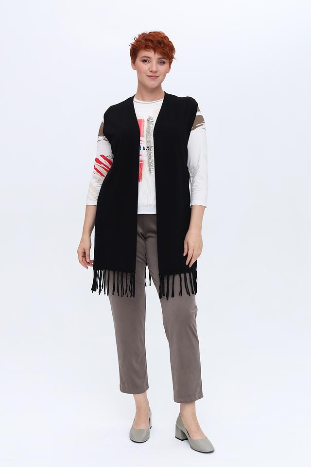 Жилет имеет прямой крой, который обеспечивает комфортную посадку по фигуре. Особенностью модели является бахрома по нижнему краю, добавляющая образу лёгкость и оригинальность.