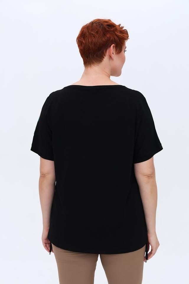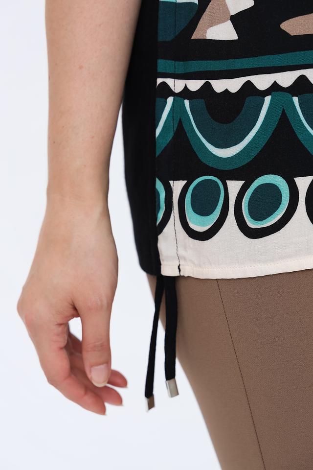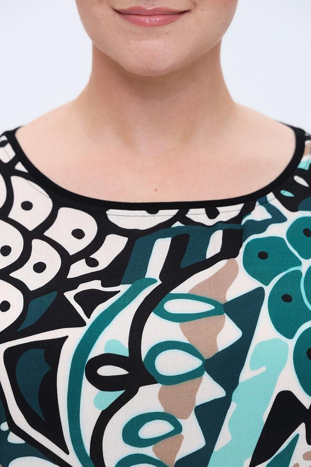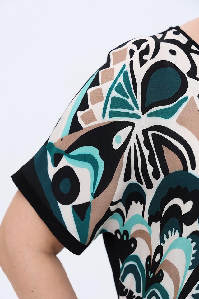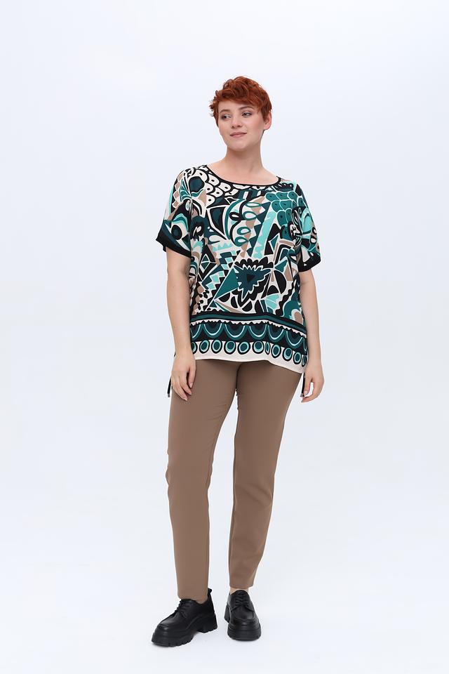 Блуза имеет свободный крой, короткие рукава и округлый вырез горловины. Главная особенность – эффектный принт, сочетающий в себе различные геометрические фигуры и цветовые оттенки: бирюзовый, бежевый, черный и белый.