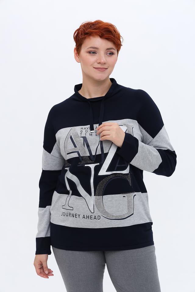 Дизайн пуловера выполнен в сочетании темно-синего и серого цветов, с крупным графичным принтом, привлекающим внимание. Капюшон добавляет практичности и создает более расслабленный образ.