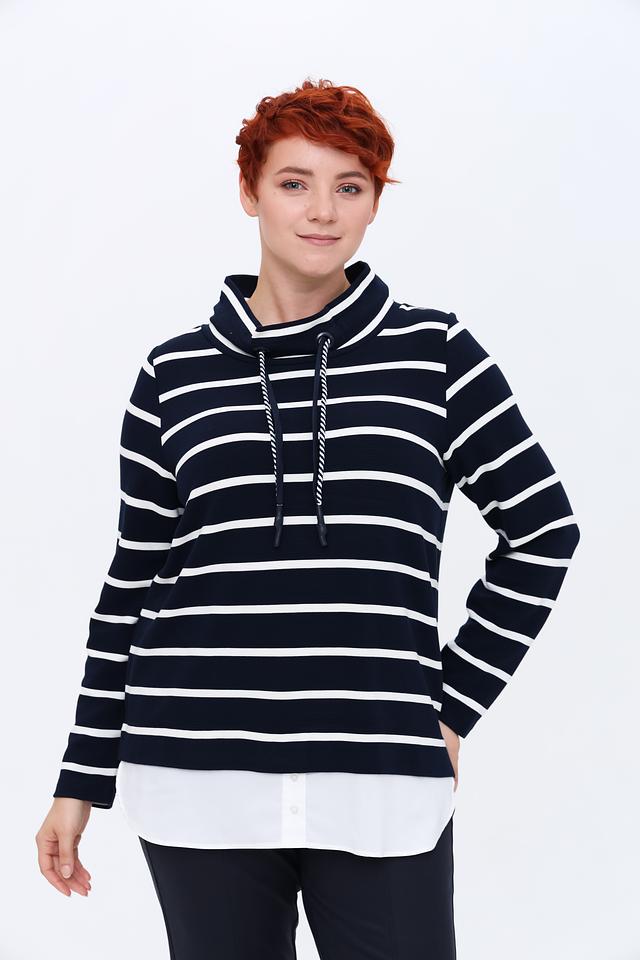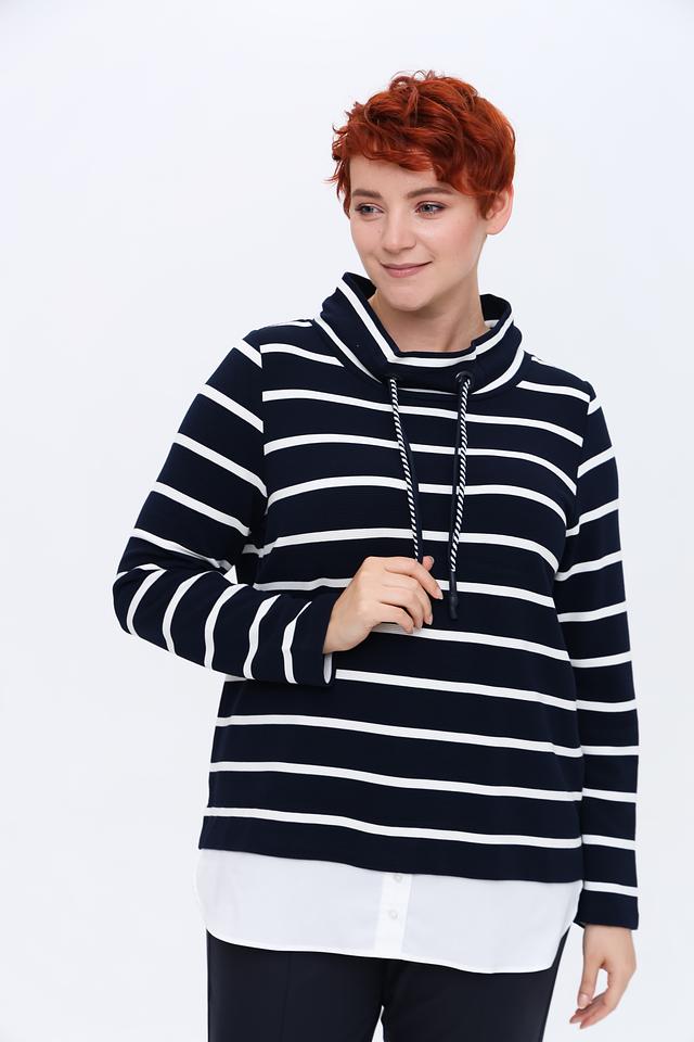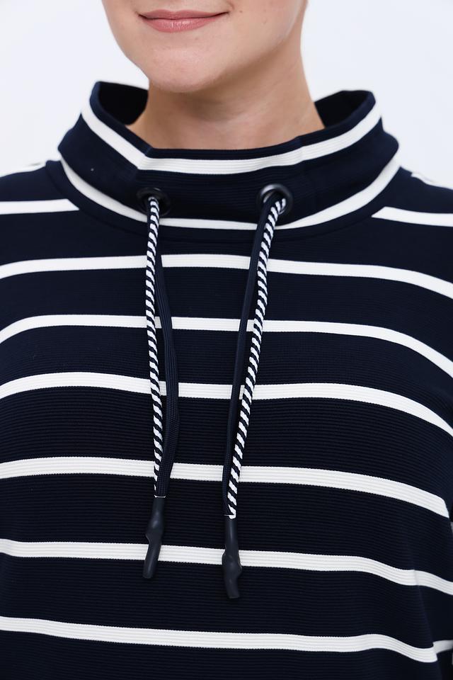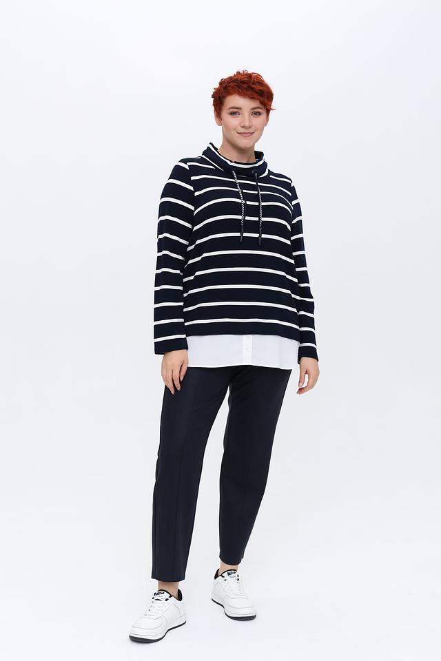 Женский пуловер Via Appia синего цвета с белыми полосами – стильная и комфортная модель с высоким воротником и шнурками. Изготовлен из мягкой вискозы с добавлением полиэстера и эластана для удобства в носке. Состав: вискоза 88%, полиэстер 10%, эластан 2%