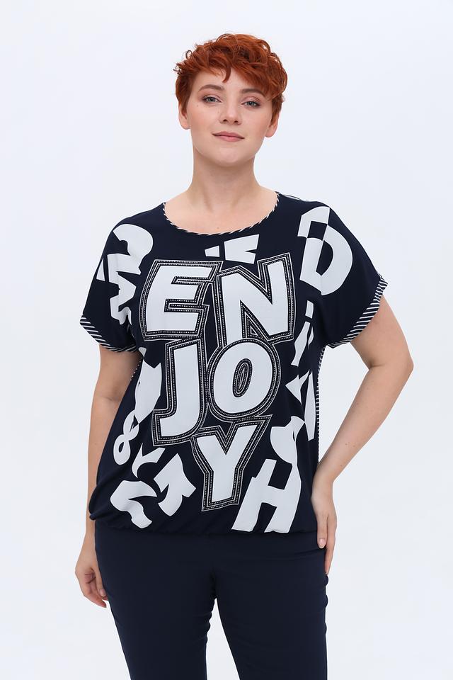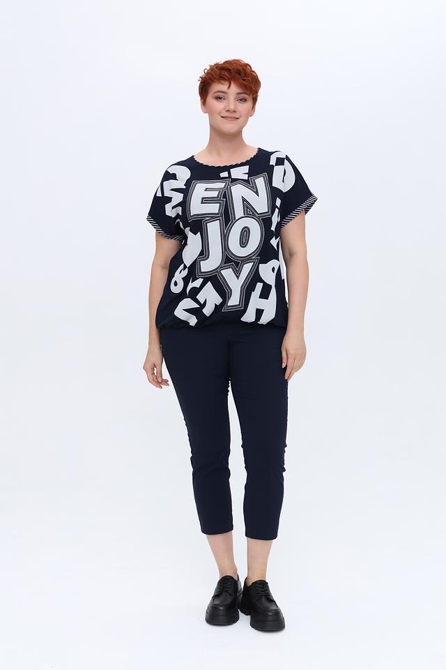 Женская футболка Via Appia темно-синего цвета с ярким белым принтом и короткими рукавами. Изготовлена из мягкой вискозы с добавлением эластана для комфорта и свободы движений. Стильный и удобный вариант для повседневного образа. Состав: вискоза 90%, эластан 10%