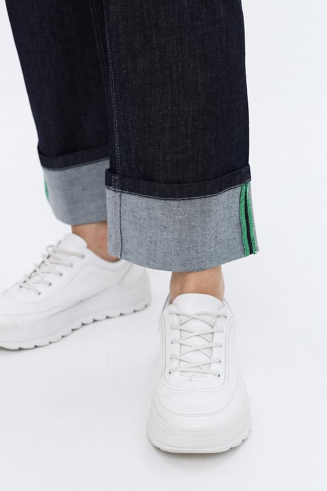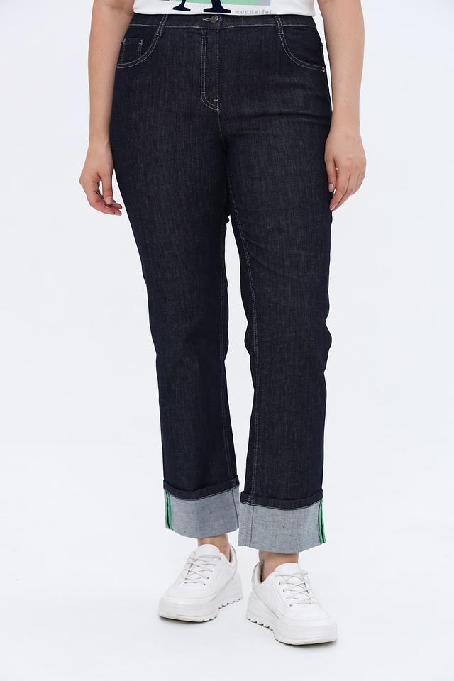 Джинсы имеют прямой крой и стандартную посадку по талии. Отличительной особенностью являются манжеты в нижней части брюк, выполненные в светло-серых тонах с тонкой зелёной полоской по краю. Такой акцент добавляет образу оригинальности.