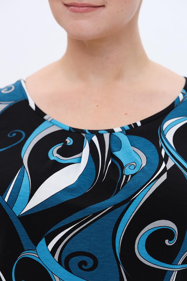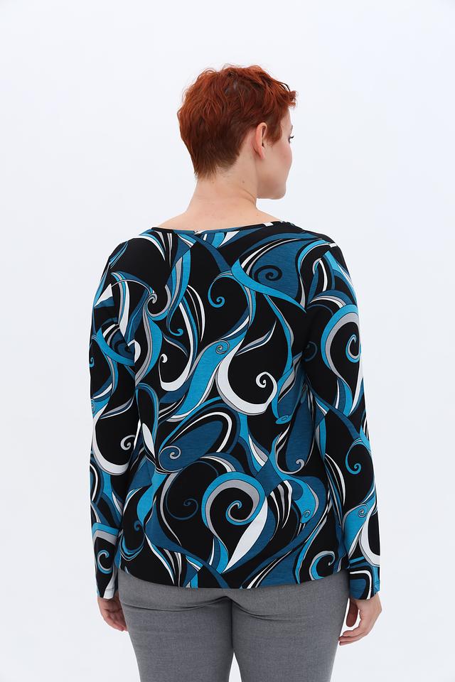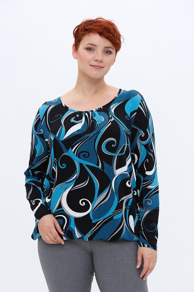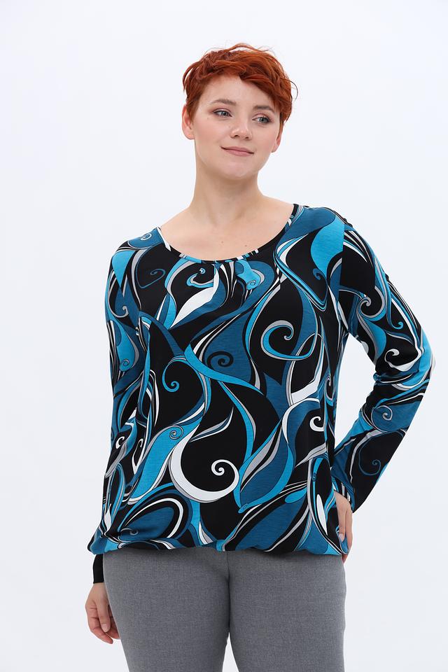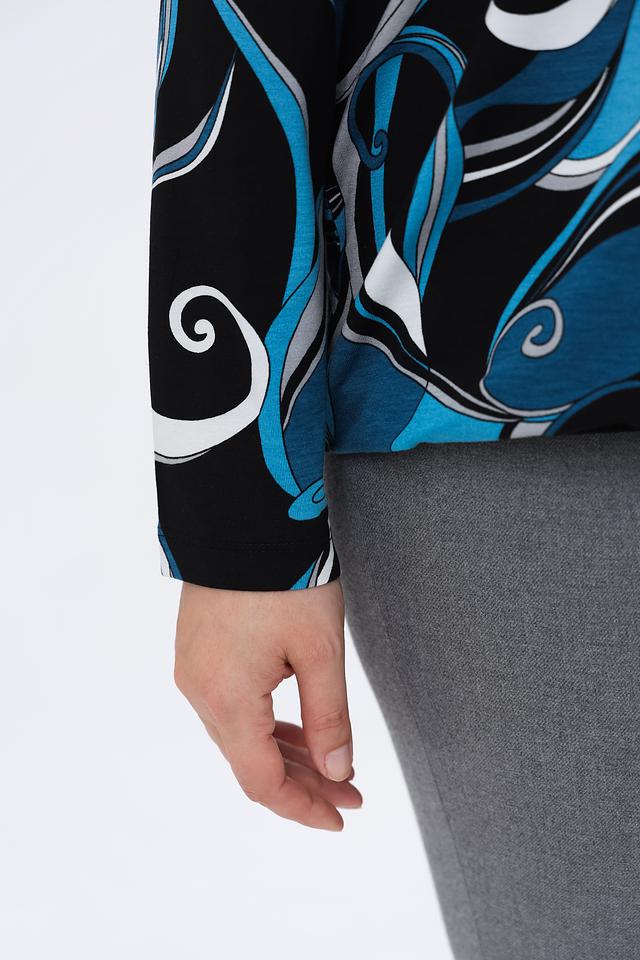 Особенностью данной модели является яркий и запоминающийся принт в синих, черных и белых тонах. Принт выполнен в виде абстрактных волн и завитков, что придает блузе динамичный и современный вид. Вырез горловины округлый, а длинные рукава делают ее подходящей для прохладной погоды.