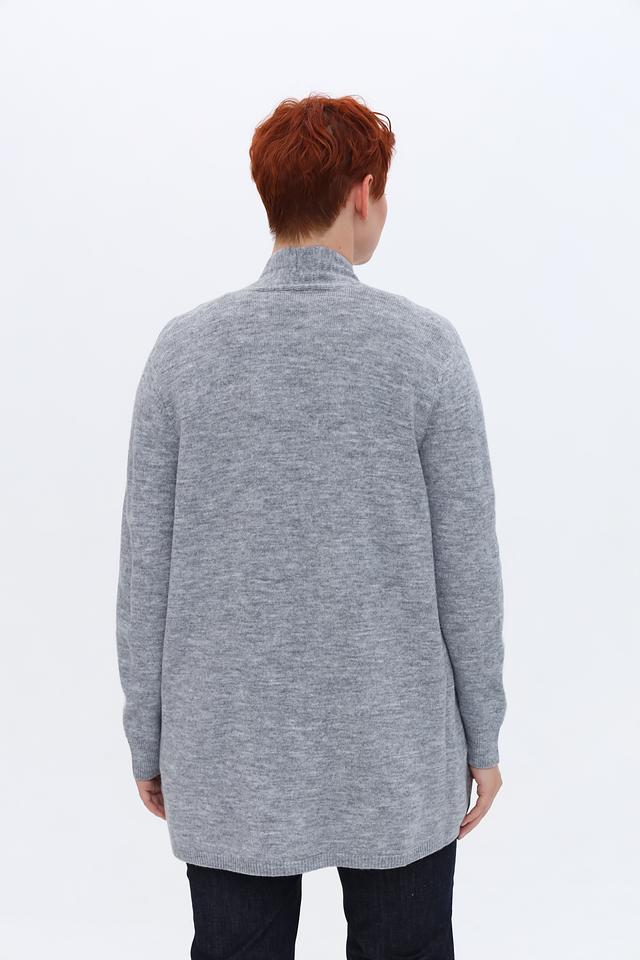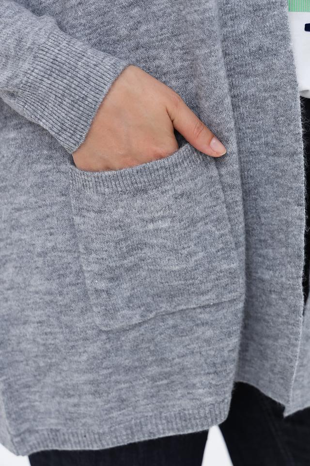 Кардиган оснащен двумя удобными карманами, в которых можно хранить мелкие предметы. Его универсальный серый меланжевый цвет легко сочетается с различными элементами одежды, создавая стильные и гармоничные образы. Этот кардиган идеально подойдет для повседневной носки в прохладную погоду.