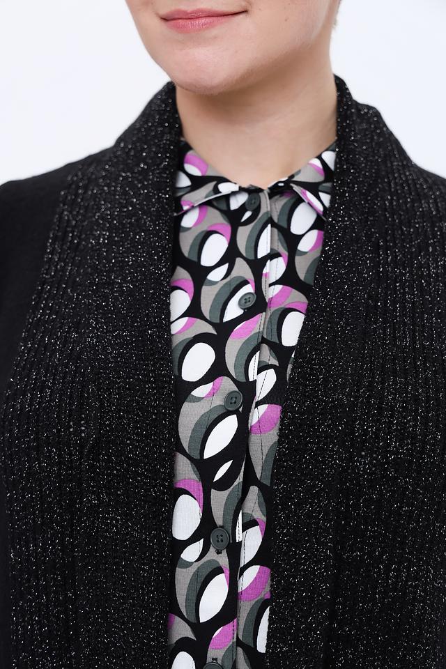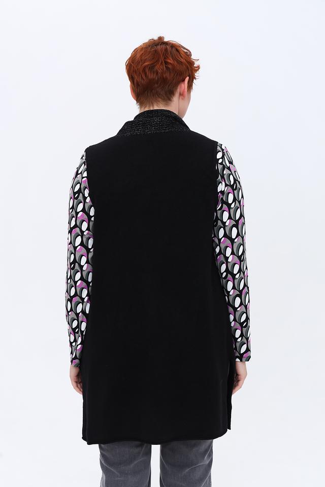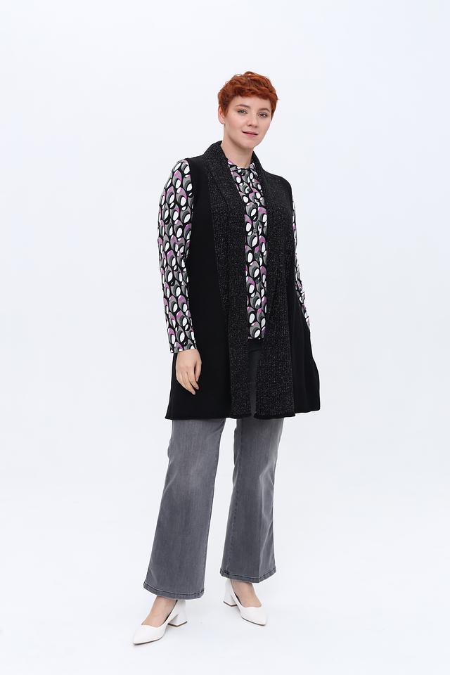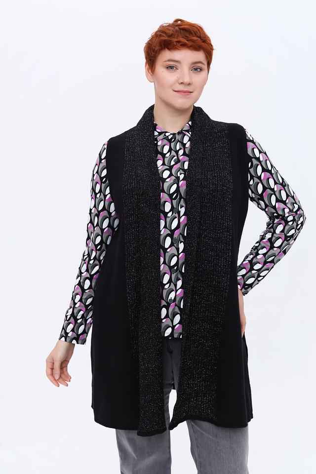 Жилет имеет удлинённый силуэт и свободный крой, что обеспечивает комфорт в носке. Текстура ткани с добавлением блестящих нитей придает изделию особый шарм и изысканность.