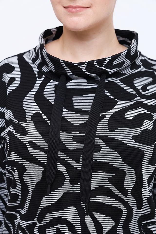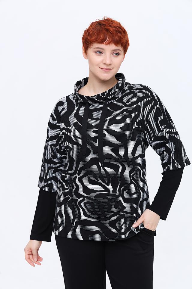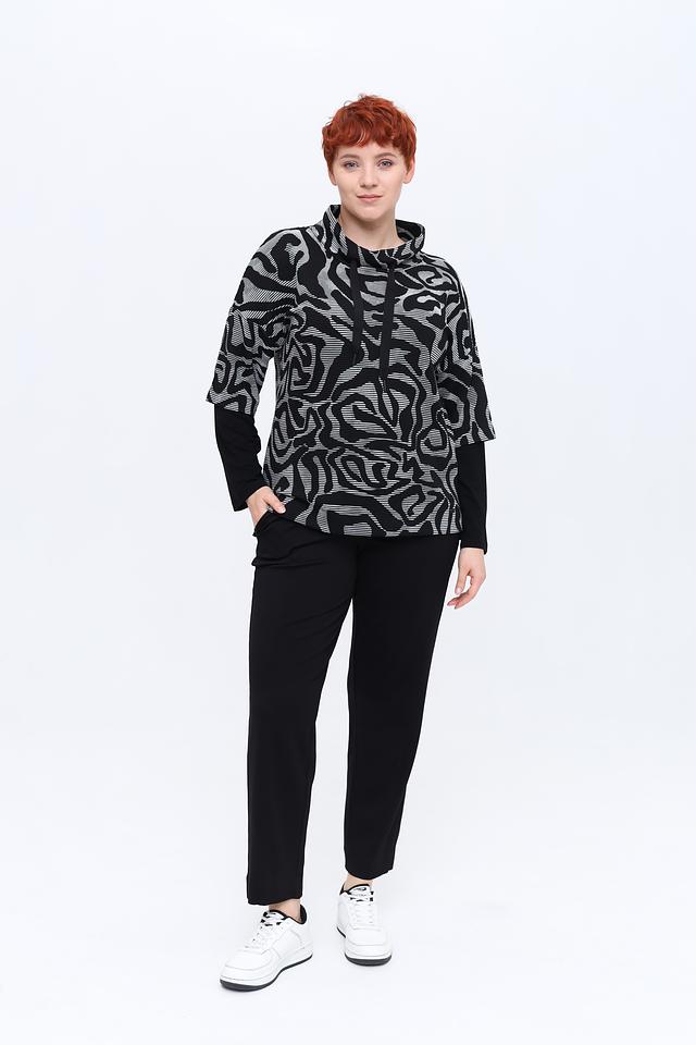 Блуза имеет свободный крой, длинные рукава и небольшой воротник-стойку с V-образным вырезом. Дополнительный акцент – черные манжеты и нижняя часть изделия, контрастирующие с основным принтом.