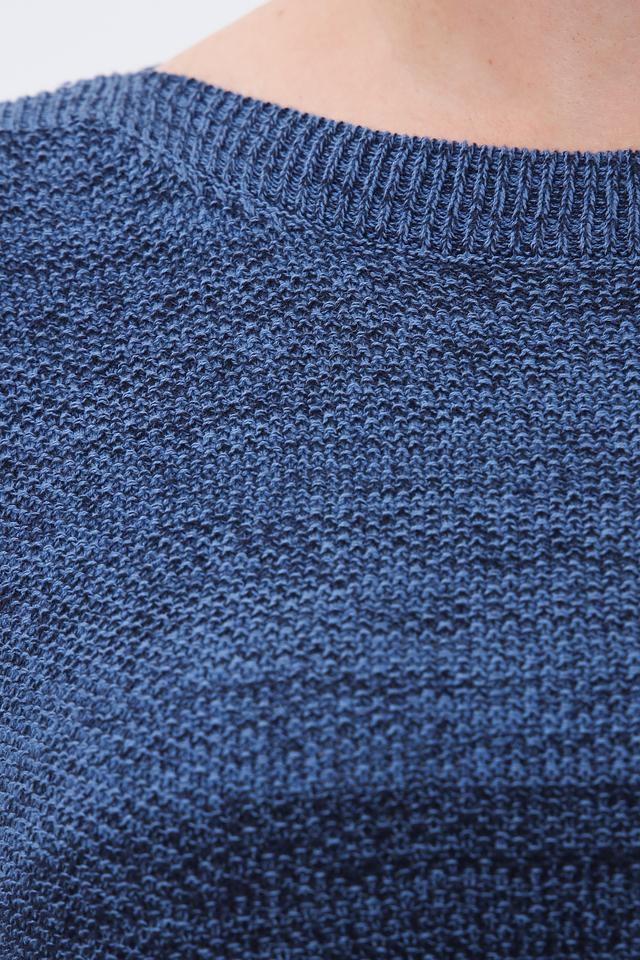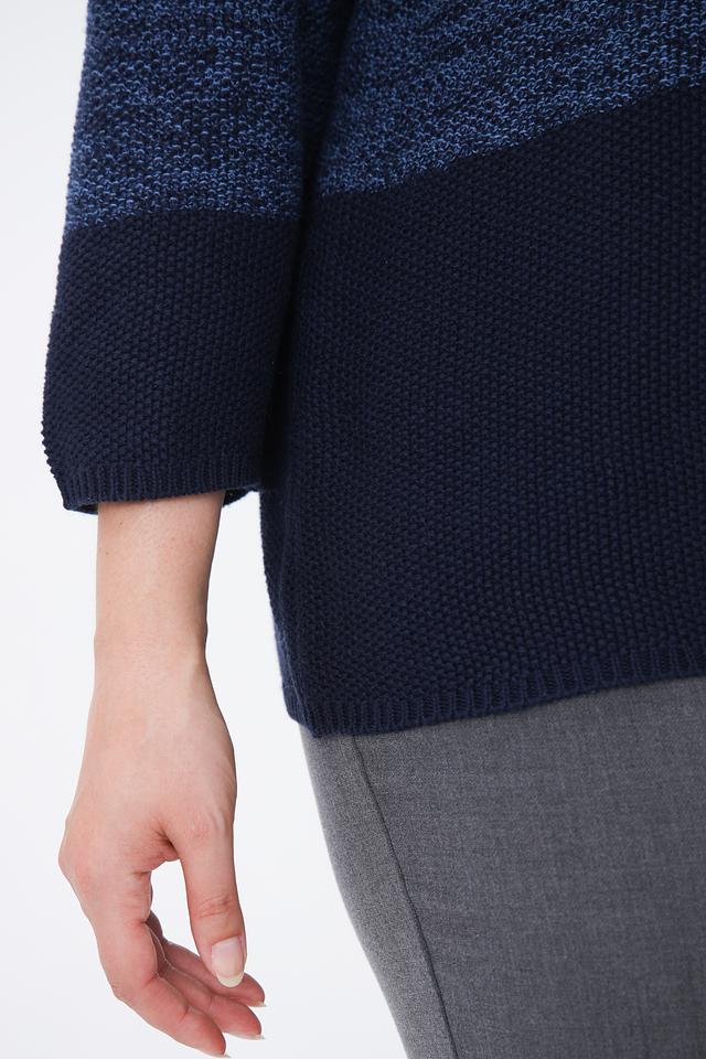 Пуловер имеет округлый вырез горловины и рукава три четверти, что делает его универсальным для различных случаев. Текстура вязки добавляет изделию объём и визуальный интерес.