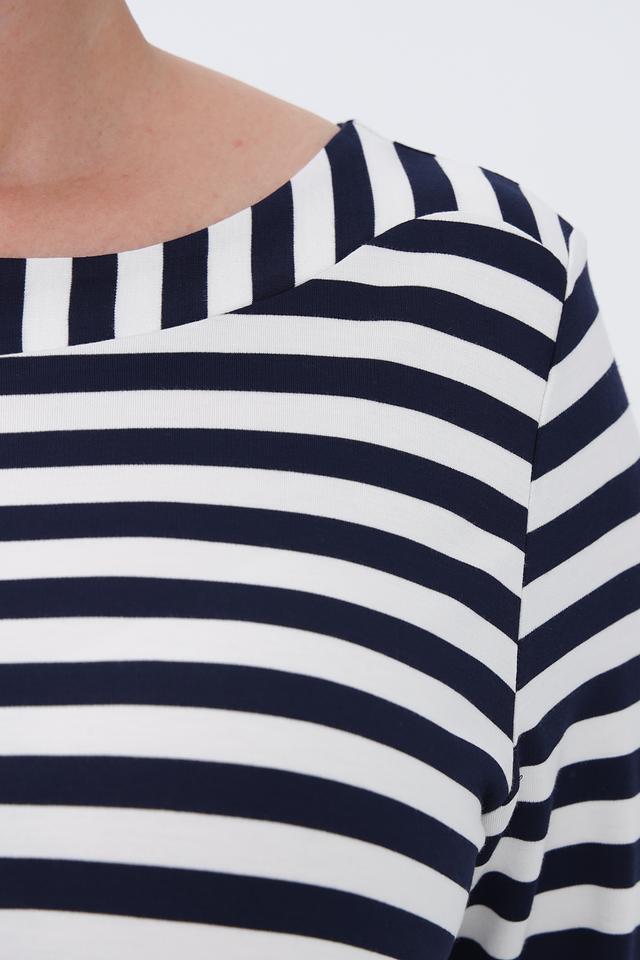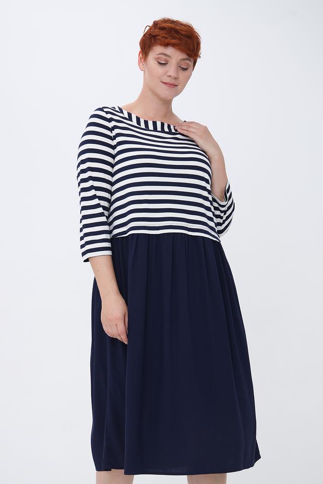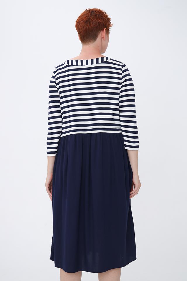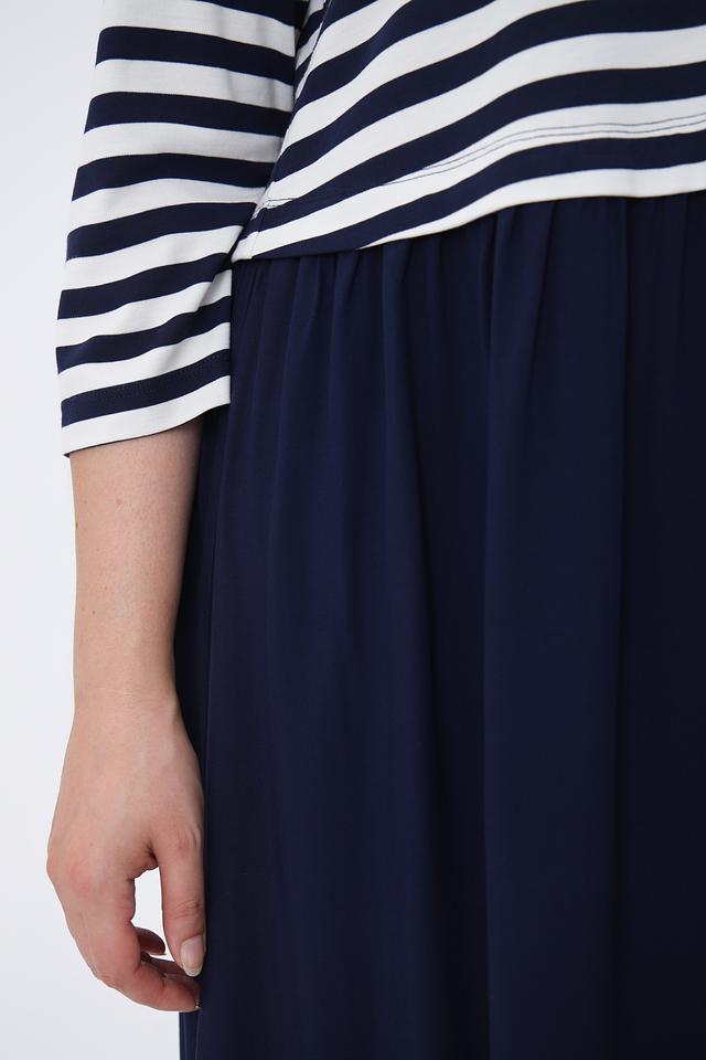 Верх платья выполнен из мягкой ткани в классическую бело-синюю полоску. Рукава длиной три четверти делают платье удобным для ношения в теплую погоду. Линия плеч слегка спущена, что придает модели расслабленный вид.