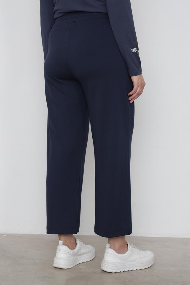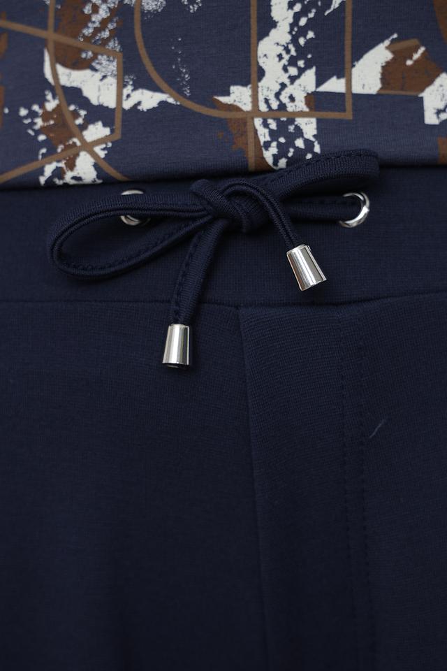 Брюки имеют прямой крой и зауженный книзу силуэт, что делает их универсальными для создания как повседневных, так и более элегантных образов. Эластичный пояс дополнен шнурком с металлическими наконечниками, обеспечивающим надежную фиксацию и возможность регулировки.
