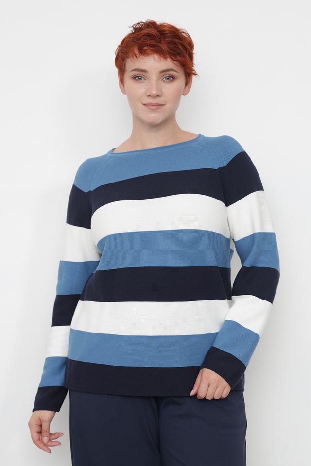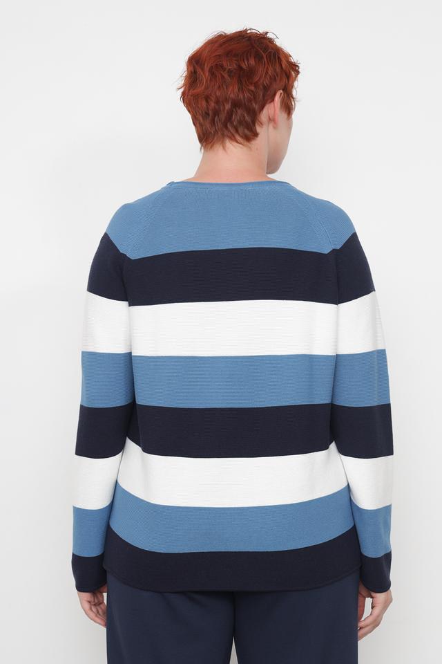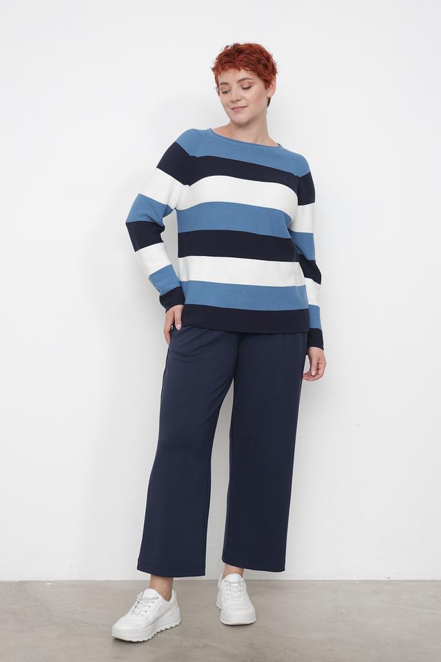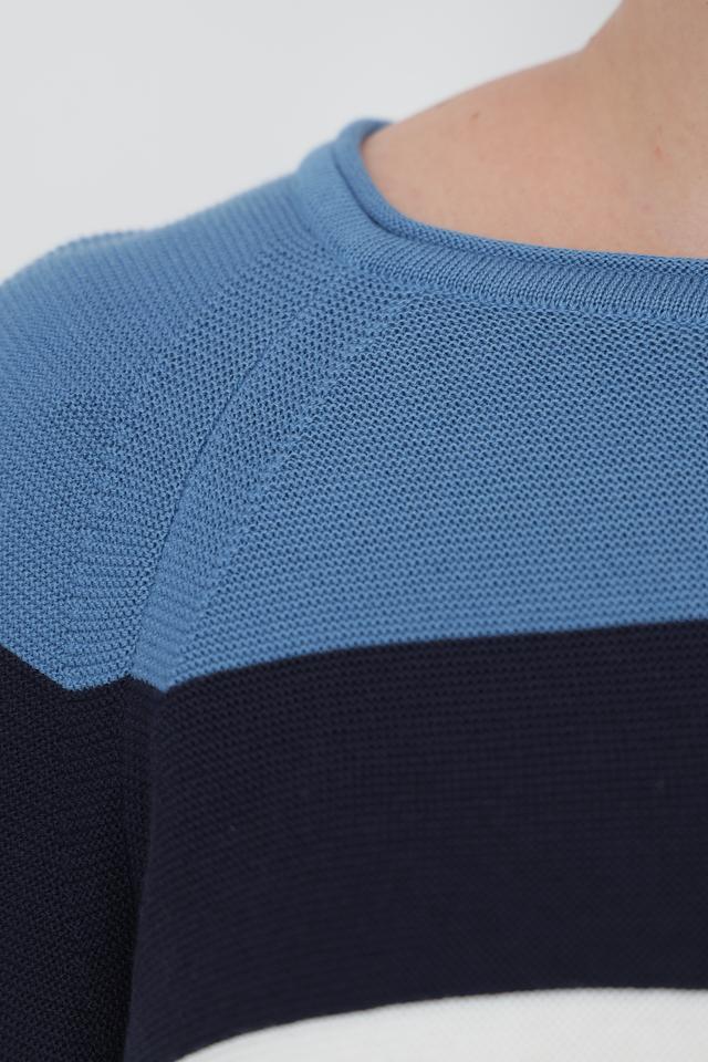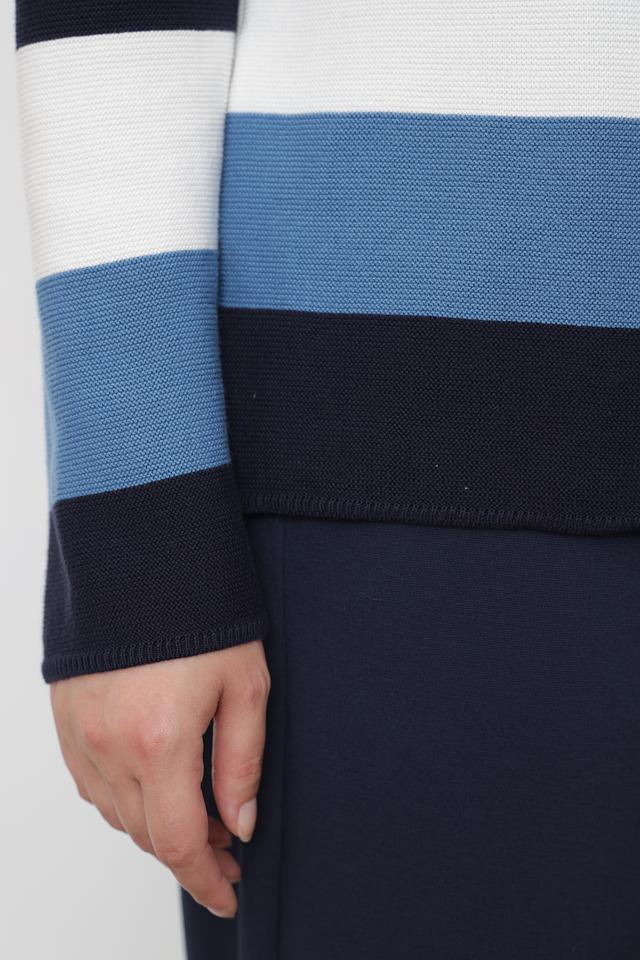 Пуловер имеет классический крой с круглым вырезом горловины и длинными рукавами. Его отличает яркий дизайн в горизонтальную полоску, сочетающий в себе оттенки синего, белого и тёмно-синего цветов. Такая расцветка придаёт изделию свежий и динамичный вид.