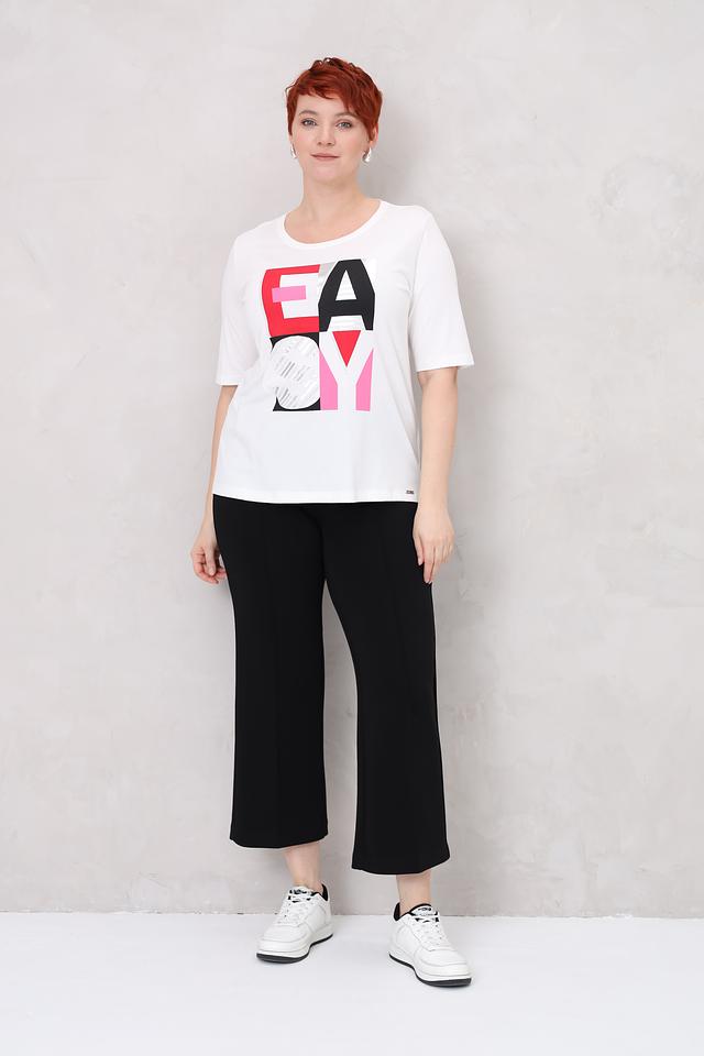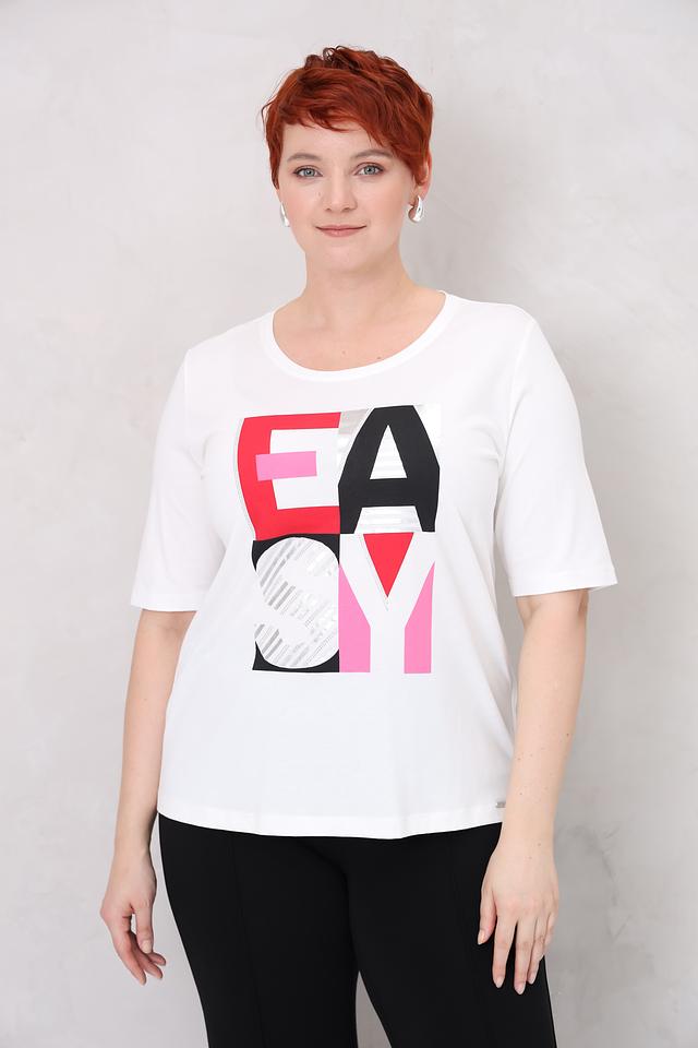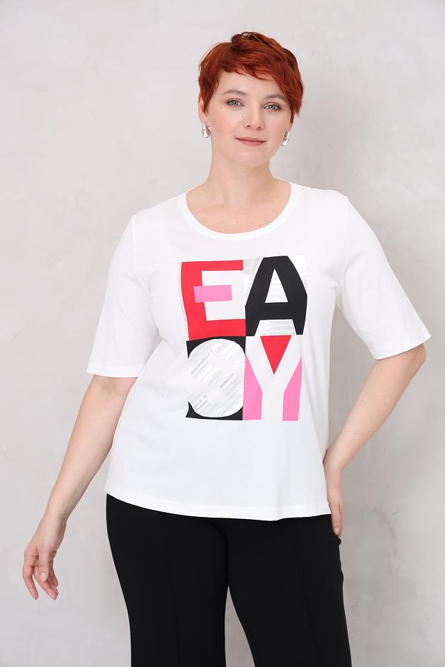 Футболка имеет свободный крой, который не сковывает движений и позволяет создать расслабленный образ. Выразительный принт с надписью "EASY" в ярких цветах – красный, розовый и серый – добавляет оригинальности и стиля.