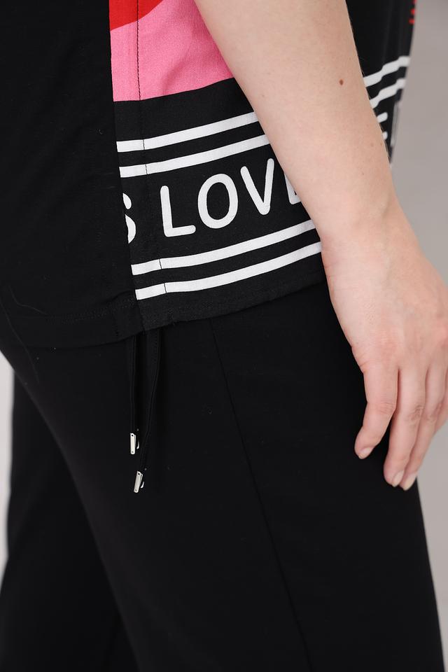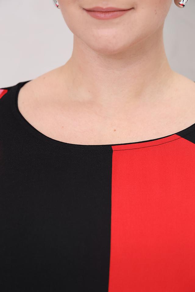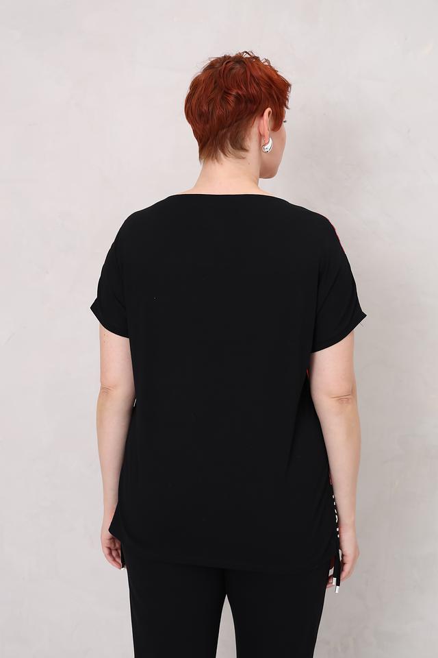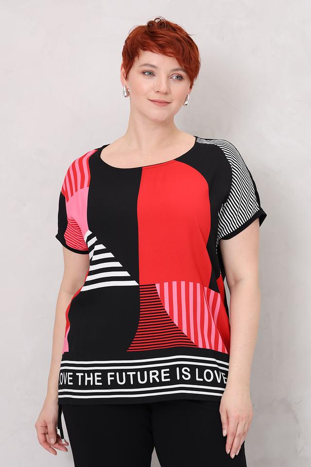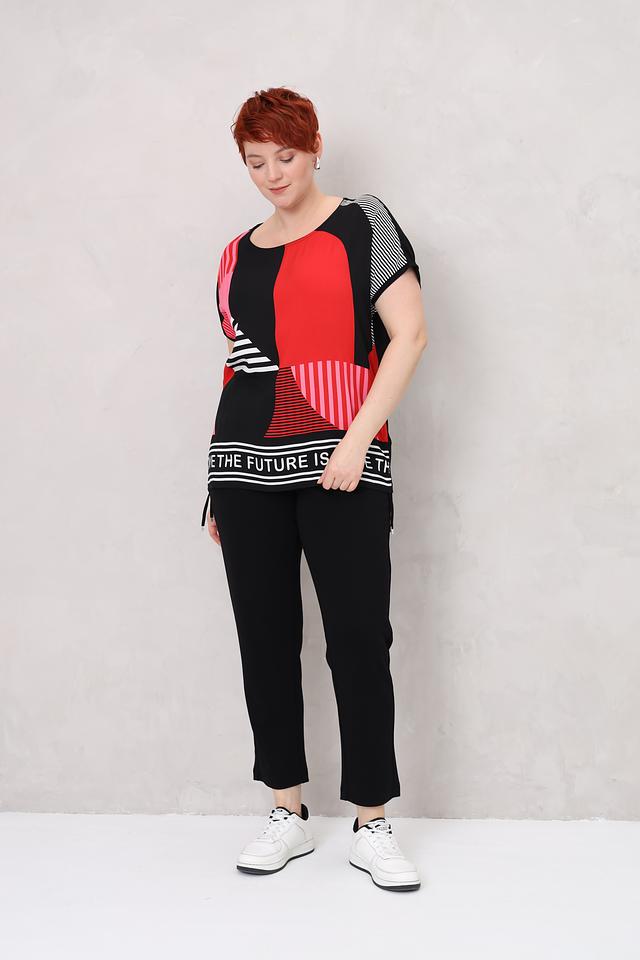 Блуза Via Appia чёрно-красного цвета с ярким геометрическим принтом и надписью. Модель свободного кроя с короткими рукавами и округлым вырезом горловины выполнена из мягкой вискозы. Состав: вискоза 100%