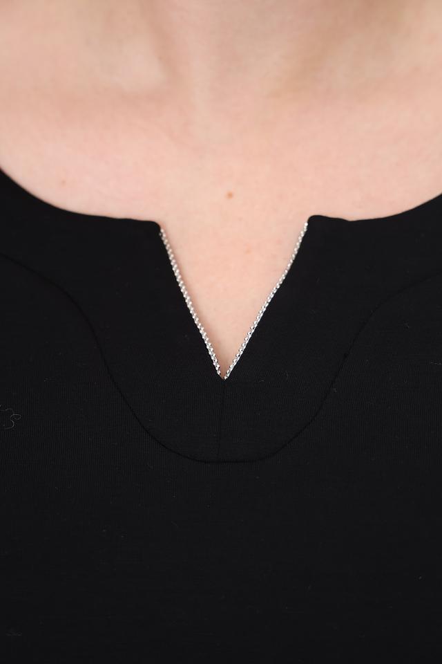 Чёрный пуловер от Via Appia с V-образным вырезом, декорированным тонкой цепочкой. Модель с рукавом 3/4 и удобным кроем станет отличным дополнением к вашему гардеробу. Состав: вискоза 49%, полиэстер 43%, эластан 8%