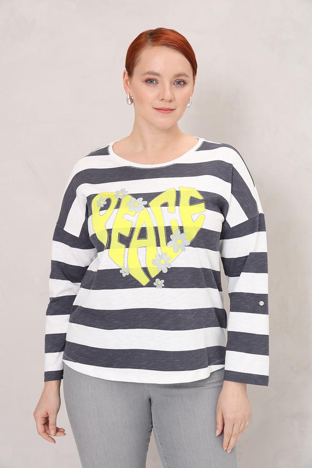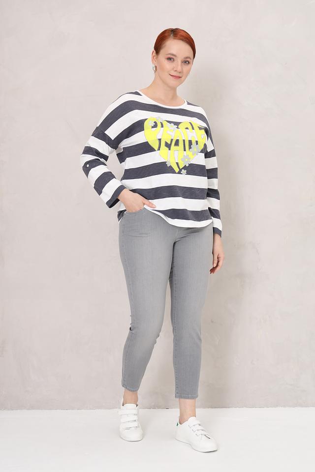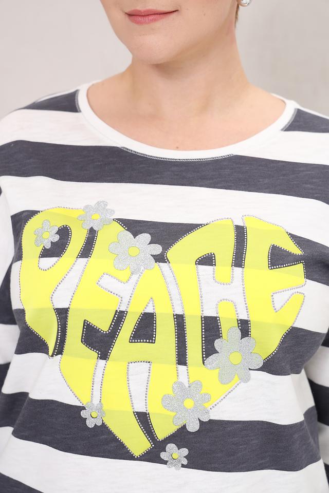 Лонгслив выполнен в классической полосатой расцветке, сочетающей серый и белый цвета. На передней части изделия расположен яркий принт в виде сердца, выполненного в жёлтом цвете и украшенного небольшими цветочными элементами.