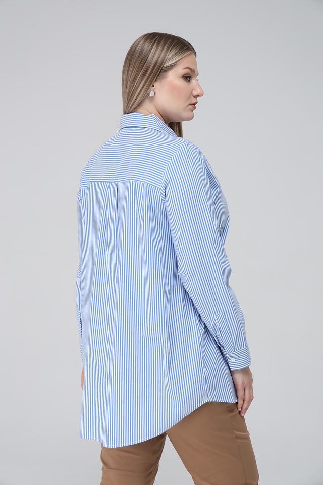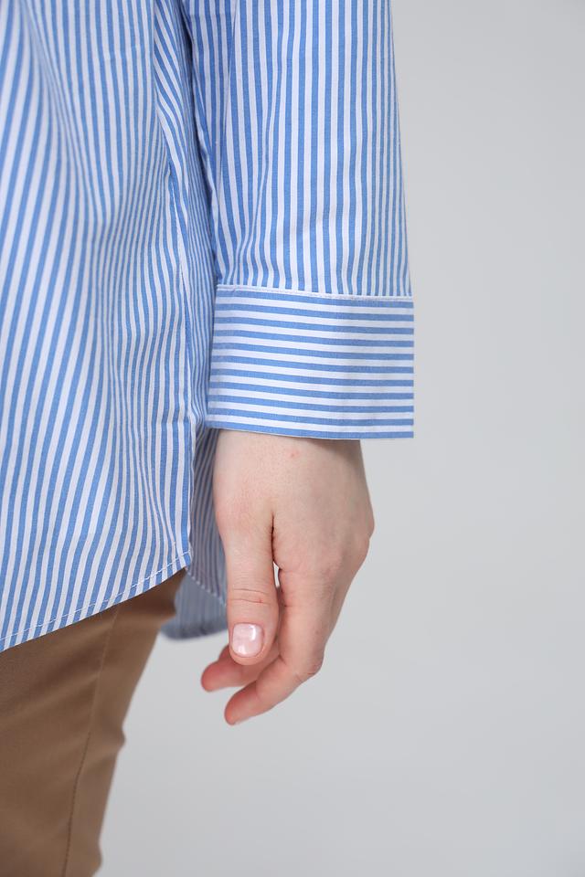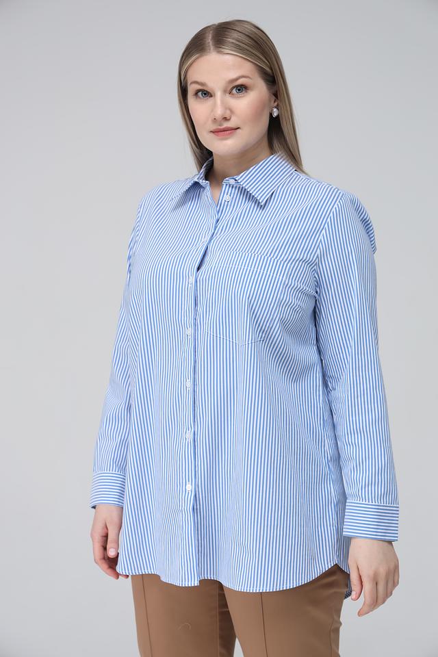 Женская рубашка Via Appia голубого цвета в бело-голубую полоску выполнена в свободном крое. Модель с длинным рукавом и классическим воротником станет отличным дополнением к вашему гардеробу. Состав: хлопок 74%, полиамид 23%, эластан 3%