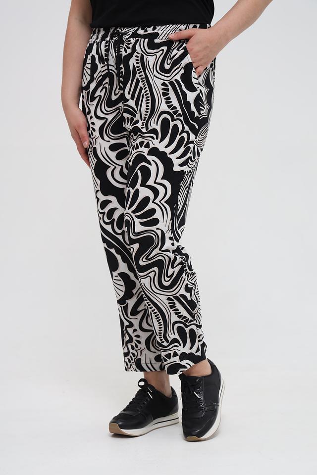 Женские брюки Via Appia DUE чёрно-белого цвета с оригинальным абстрактным принтом. Модель выполнена из мягкой вискозы, обеспечивающей комфорт в носке, и дополнена эластичным поясом с кулиской. Состав: вискоза 100%